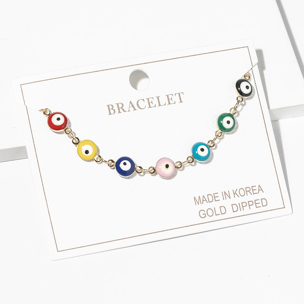 Details • Size : 0.25" H, 7.25" + 1" L • Lobster Clasp Closure • Playful evil eye link bracelet designed with a series of round charms symbolizing protection and positivity. A chic, lightweight accessory that adds a touch of color and meaning to your look, perfect for layering or wearing solo as a trendy everyday good luck piece. • Gold Dipped • Lead and Nickel Compliant • Made In Korea