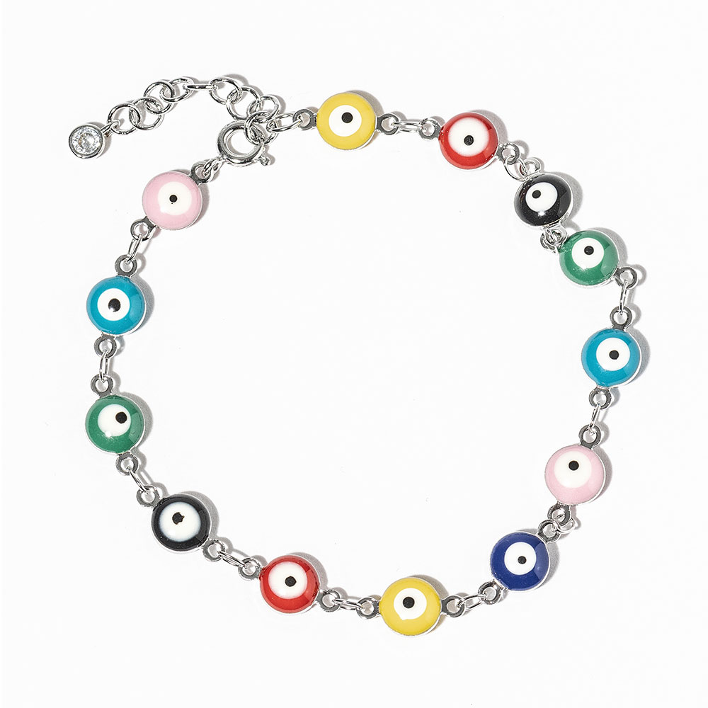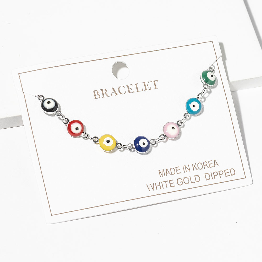 Details • Size : 0.25" H, 7.25" + 1" L • Lobster Clasp Closure • Playful evil eye link bracelet designed with a series of round charms symbolizing protection and positivity. A chic, lightweight accessory that adds a touch of color and meaning to your look, perfect for layering or wearing solo as a trendy everyday good luck piece. • Gold Dipped • Lead and Nickel Compliant • Made In Korea