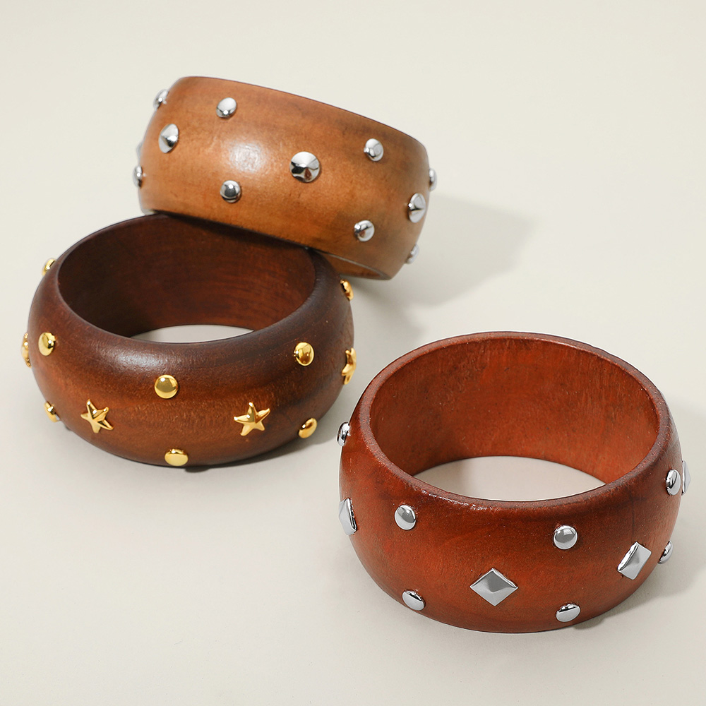 Metal Stud Embellished Wide Wooden Bangle Bracelet
