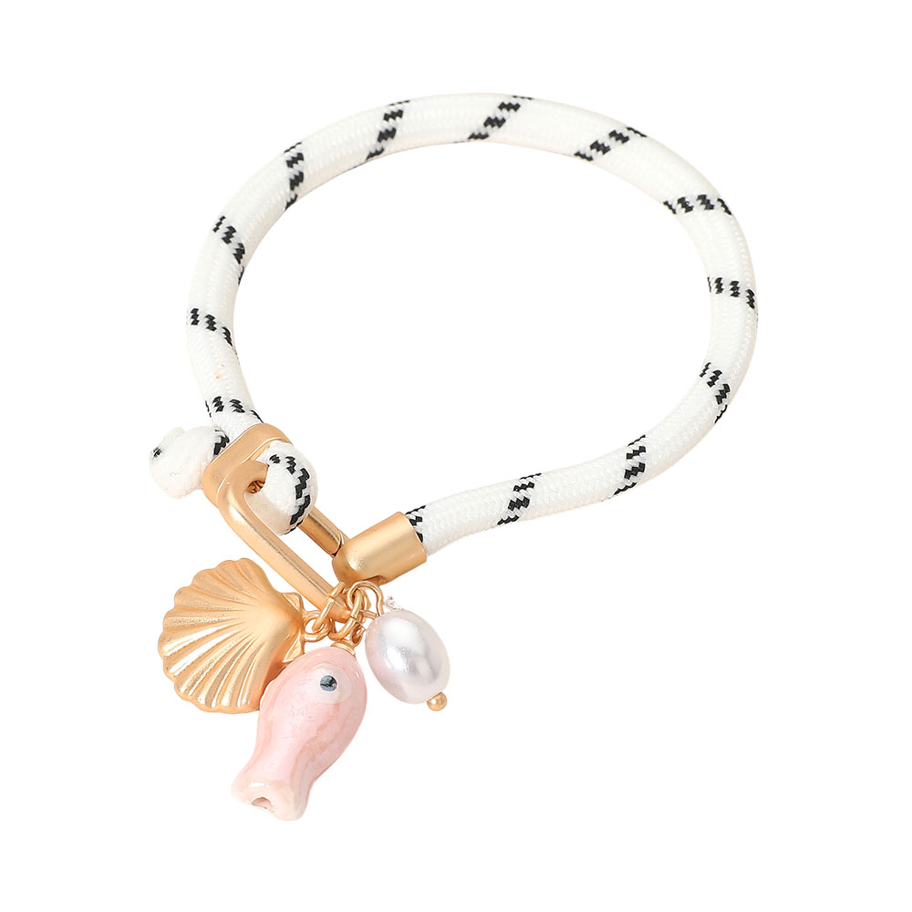 Details • Size : 7.5" + 0.75" L • Charm Size : 1" L • Bring seaside charm to your style with this ocean-inspired rope bracelet featuring delightful fish, shell, and pearl-like charms. Its nautical design blends playful details with casual sophistication, making it an ideal accessory for beach days or effortlessly chic everyday wear. • Lead and Nickel Compliant