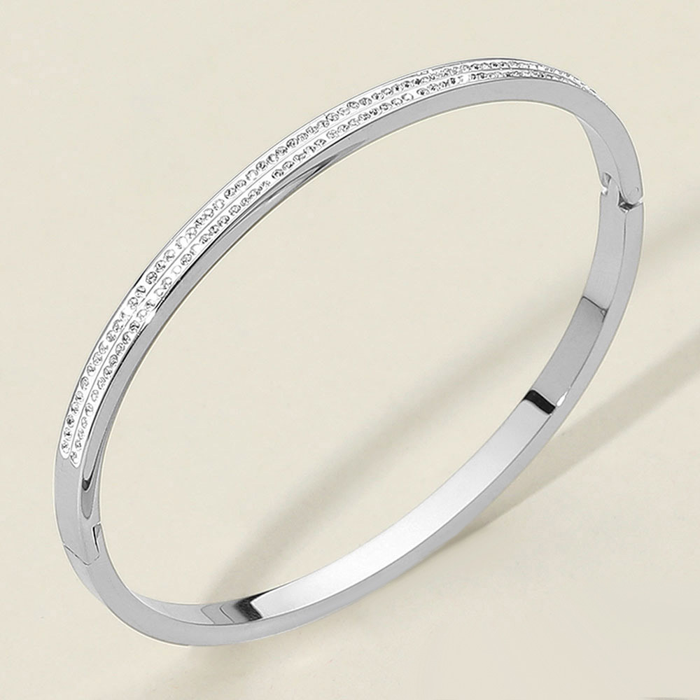 • Minimalist hinged bangle bracelet with double-row pavĂ© rhinestone accents. A refined accessory perfect for layering or solo wear, ideal for both casual and formal outfits.