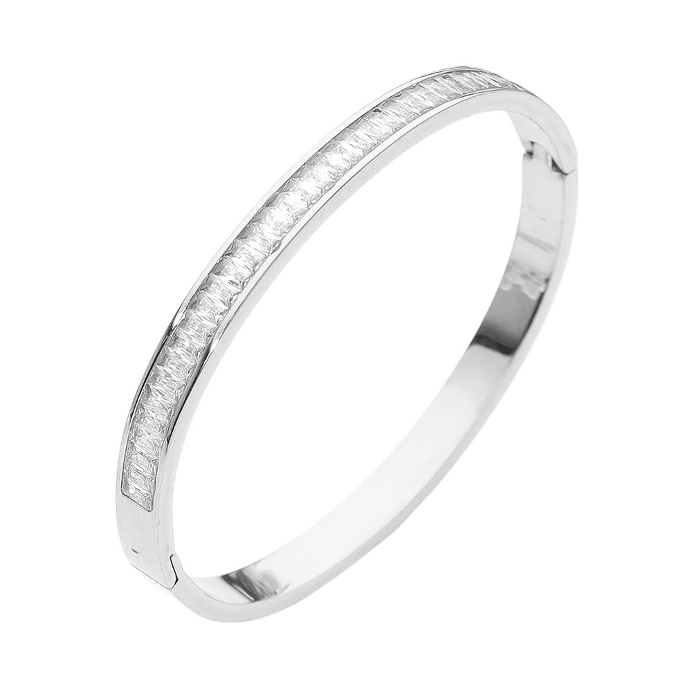 • Sleek hinge bangle bracelet featuring a refined row of crystal accents set along a polished silhouette for subtle sparkle and modern elegance. Designed for effortless wear, it elevates everyday outfits or completes evening looks with a timeless, sophisticated statement.