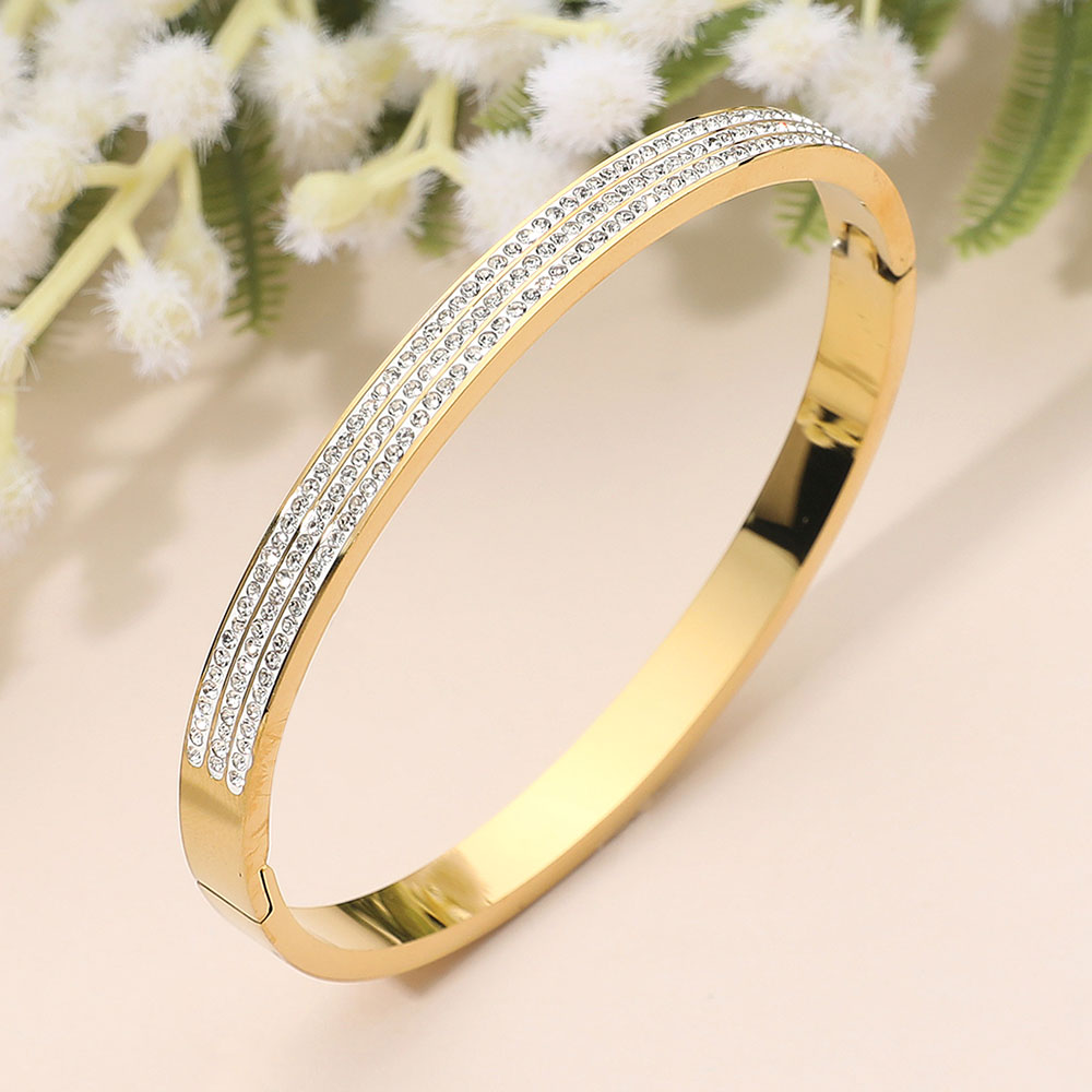Details • Size : 0.25" H, 2.3" D • Hinged Closure • Water Resistant • Sophisticated hinge bangle bracelet featuring three rows of delicate crystal accents set into a sleek polished silhouette for radiant sparkle and refined style. Designed for effortless wear, it transitions seamlessly from everyday outfits to evening looks, adding timeless elegance when worn alone or layered. • Hypoallergenic • Stainless Steel
