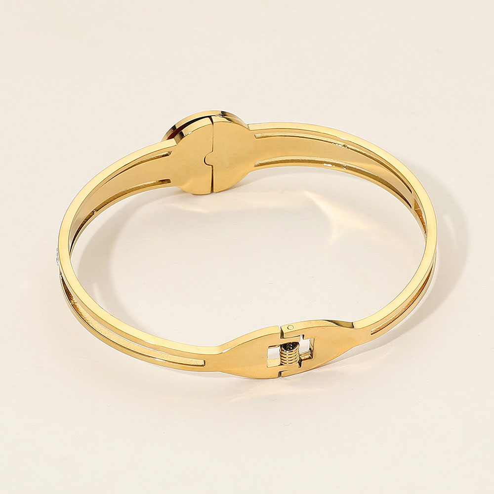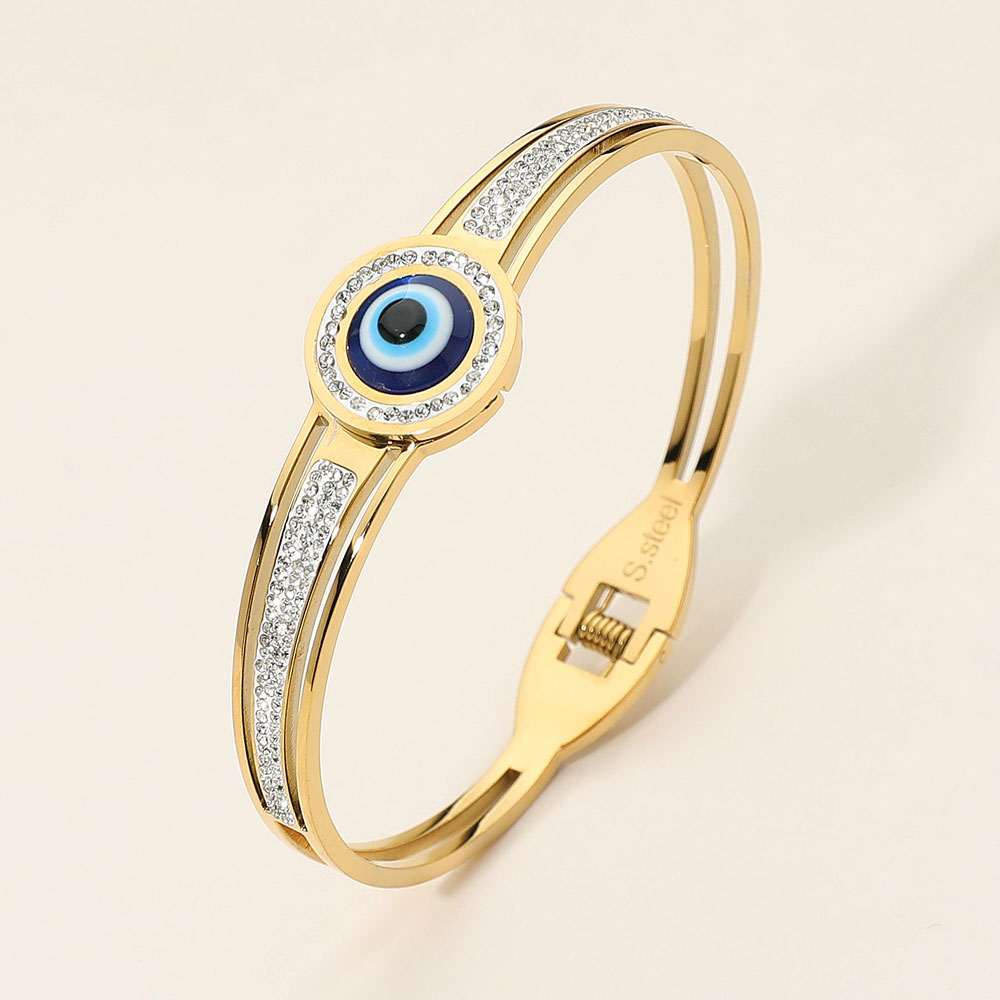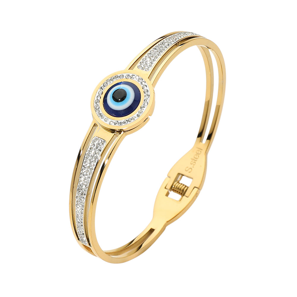 • This elegant bangle features a symbolic protective charm encircled by sparkling crystal accents. Designed with a sleek, modern silhouette, it combines meaning and sophistication, making it a perfect accessory for both daily wear and special occasions.