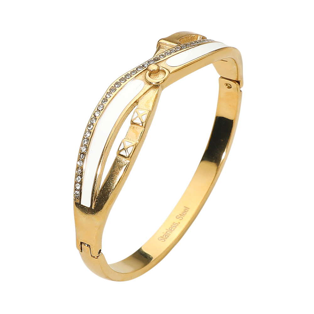 Details • Size : 0.6" H, 2.5" D • Hinged Closure • Modern bangle bracelet featuring geometric detailing and sleek contrasting inlay with a sparkling accent line. Designed with a secure hinged closure, this sophisticated piece adds a refined edge to both everyday looks and evening ensembles. • CZ Cubic Zirconia • Stainless Steel