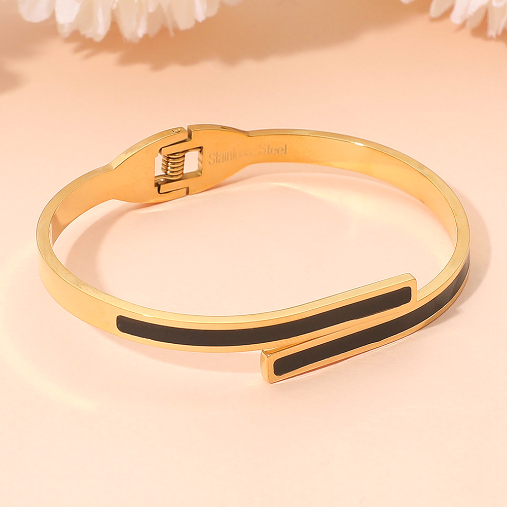 Details • Size : 0.5" H, 2.3" D • Hinged Closure • Elegant bangle bracelet featuring a sleek overlapping design enhanced with a refined inlay detail. Its minimalist yet stylish look makes it a versatile accessory, perfect for adding a touch of sophistication to everyday outfits or evening ensembles. • Stainless Steel