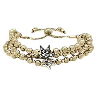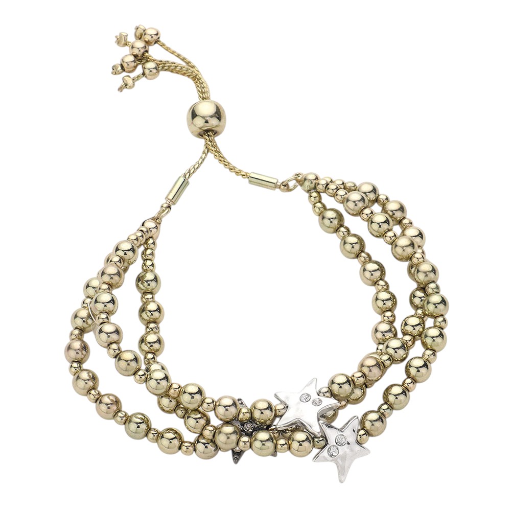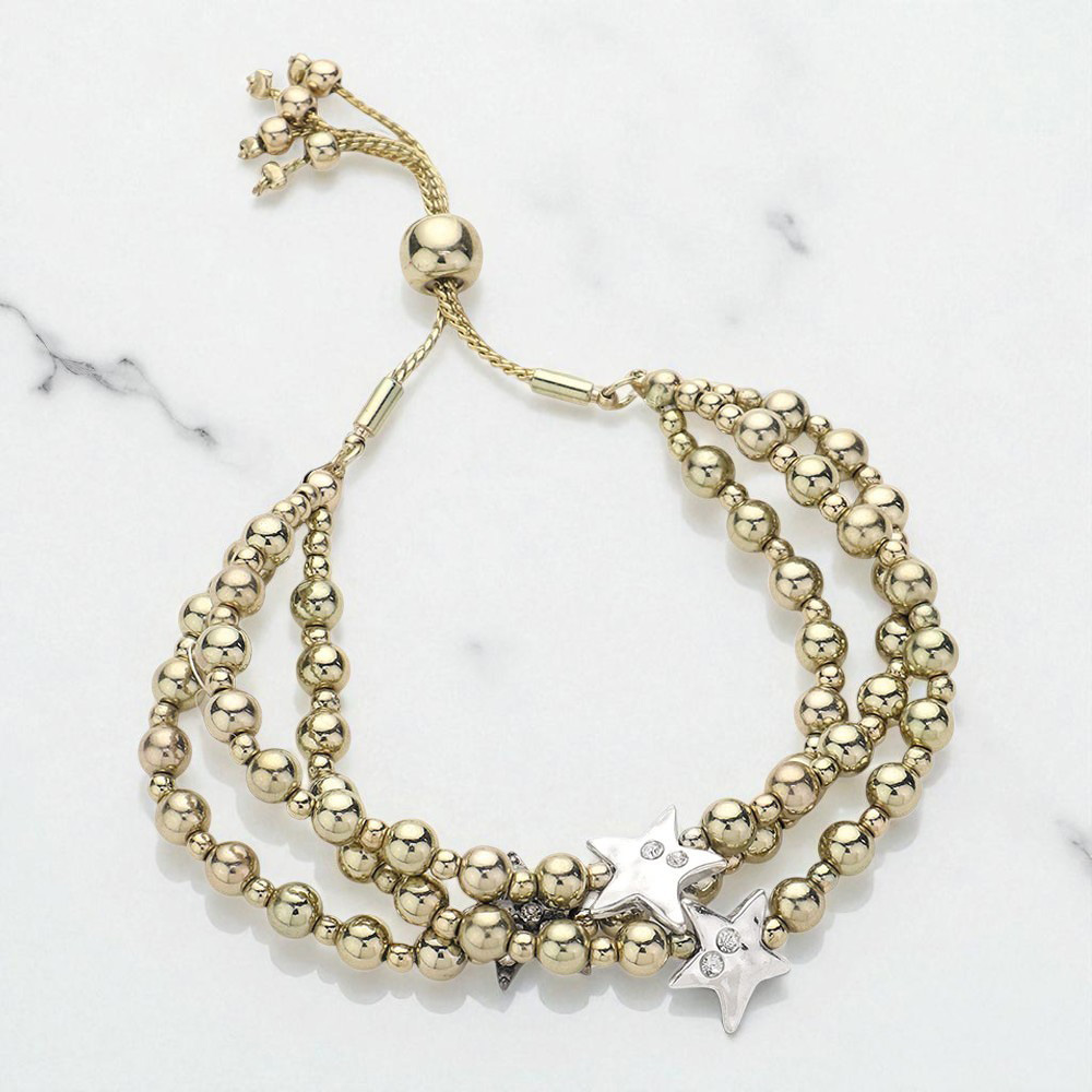 Stone Paved Star Pointed Beaded Triple Layered Pull Tie Cinch Bracelet
