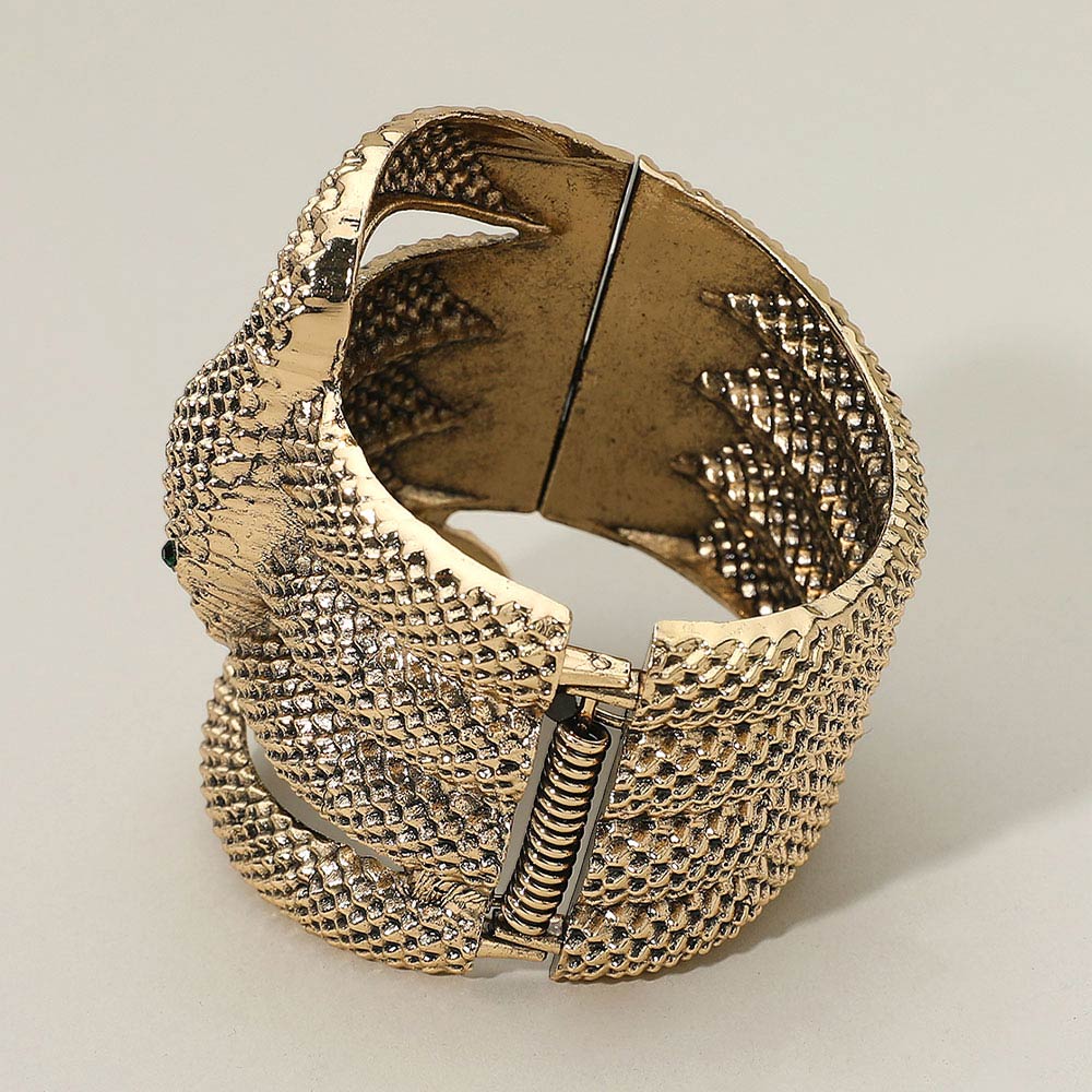 Details • Size : 2.75" H, 2.25" D • Hinged Closure • Striking coiled snake bracelet featuring a detailed serpent wrap design with textured scales and bold sculptural form. This statement cuff adds a fierce, fashion-forward edge to any outfit, perfect for showcasing confidence and individuality in both casual and evening looks. • Lead and Nickel Compliant