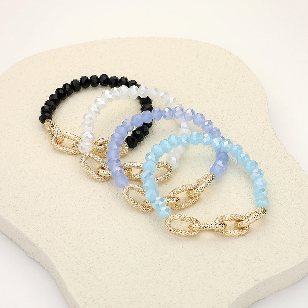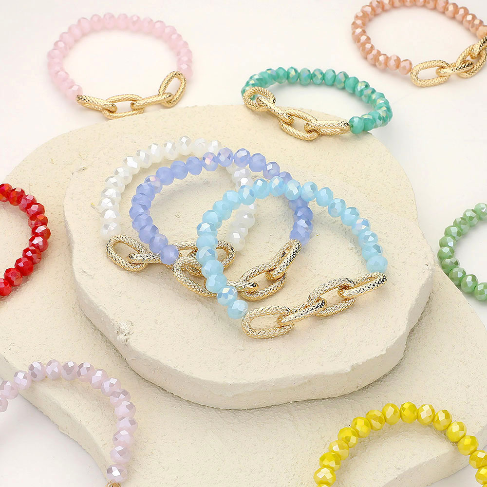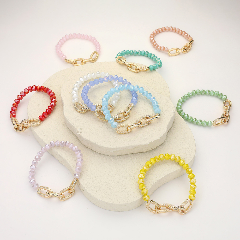 Details • Size : 0.4" H • Stretchable • Stylish beaded bracelet featuring faceted beads paired with a bold textured chain link accent. This versatile design blends elegance with modern flair, making it perfect for layering or wearing solo. • Lead and Nickel Compliant