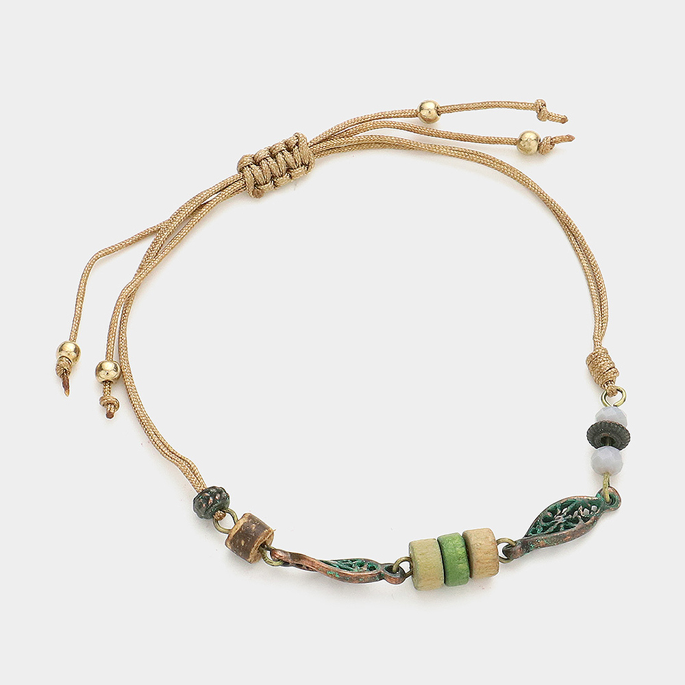 Wood Metal Beaded Tassel Multi Strand Adjustable Cinch Pull Tie Bracelet