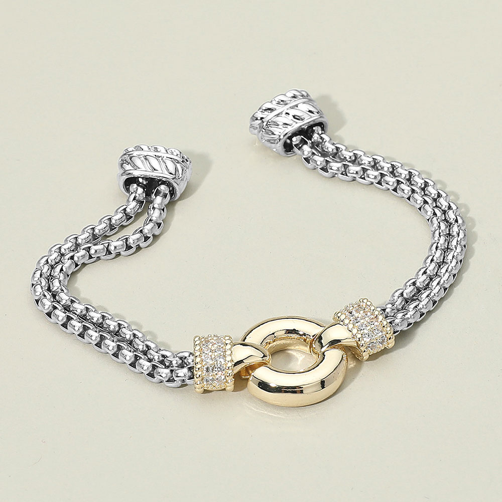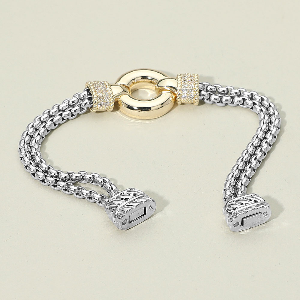 Details • Size : 0.75" H, 7.25" L • Magnetic Closure • Modern dual chain bracelet featuring a bold circular centerpiece with sparkling accents. Designed with intricate detailing for a refined touch, this statement piece is perfect for elevating both casual and formal looks. • CZ Cubic Zirconia • Gold Dipped