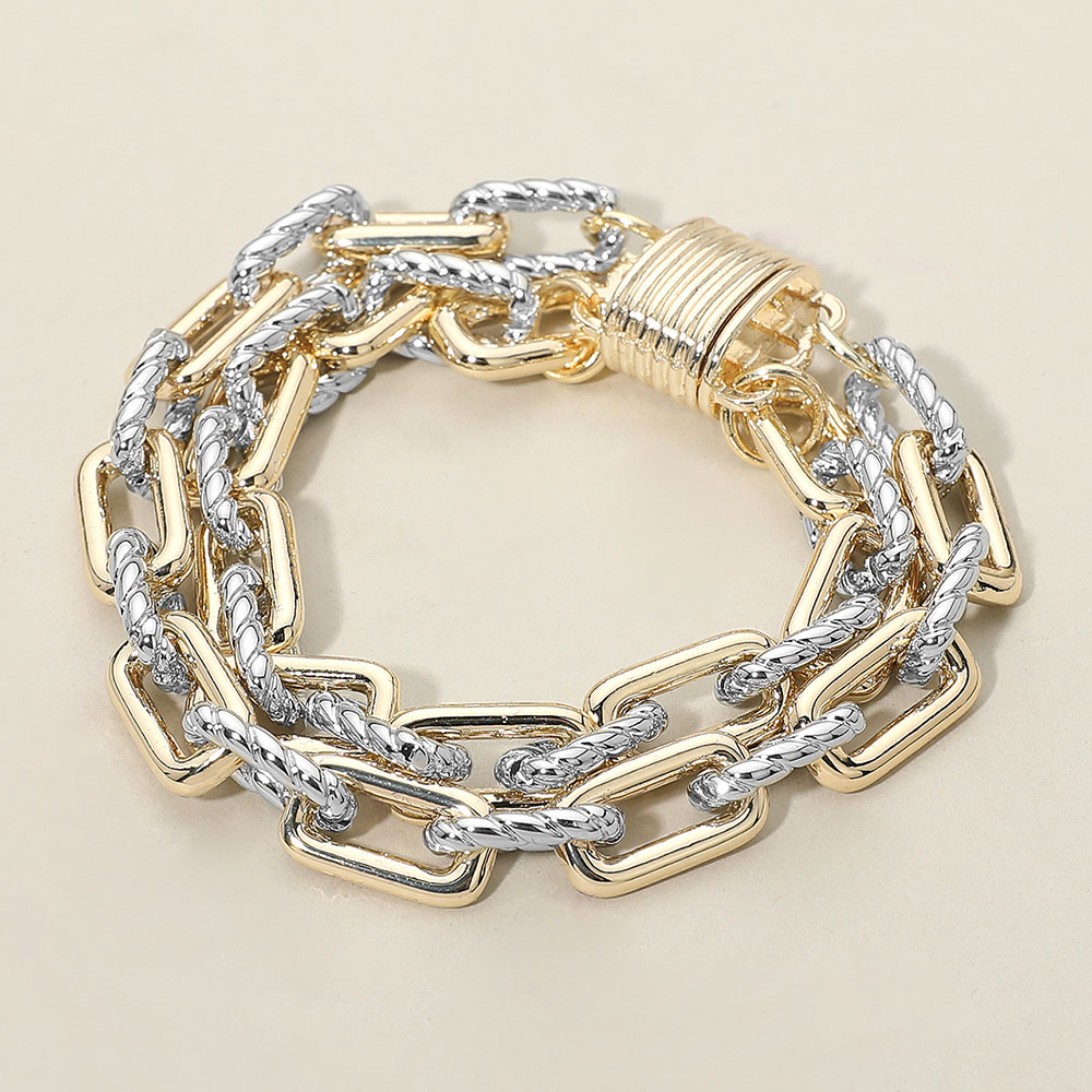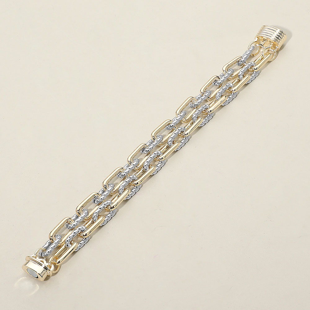 Details • Size : 0.75" H, 7.5" L • Magnetic Closure • A striking layered chain bracelet featuring interlocking links in a refined dual-tone finish, paired with a bold magnetic clasp for effortless wear. Its modern, structured design adds sophistication and standout detail to everyday looks or elevated ensembles. • Gold Dipped