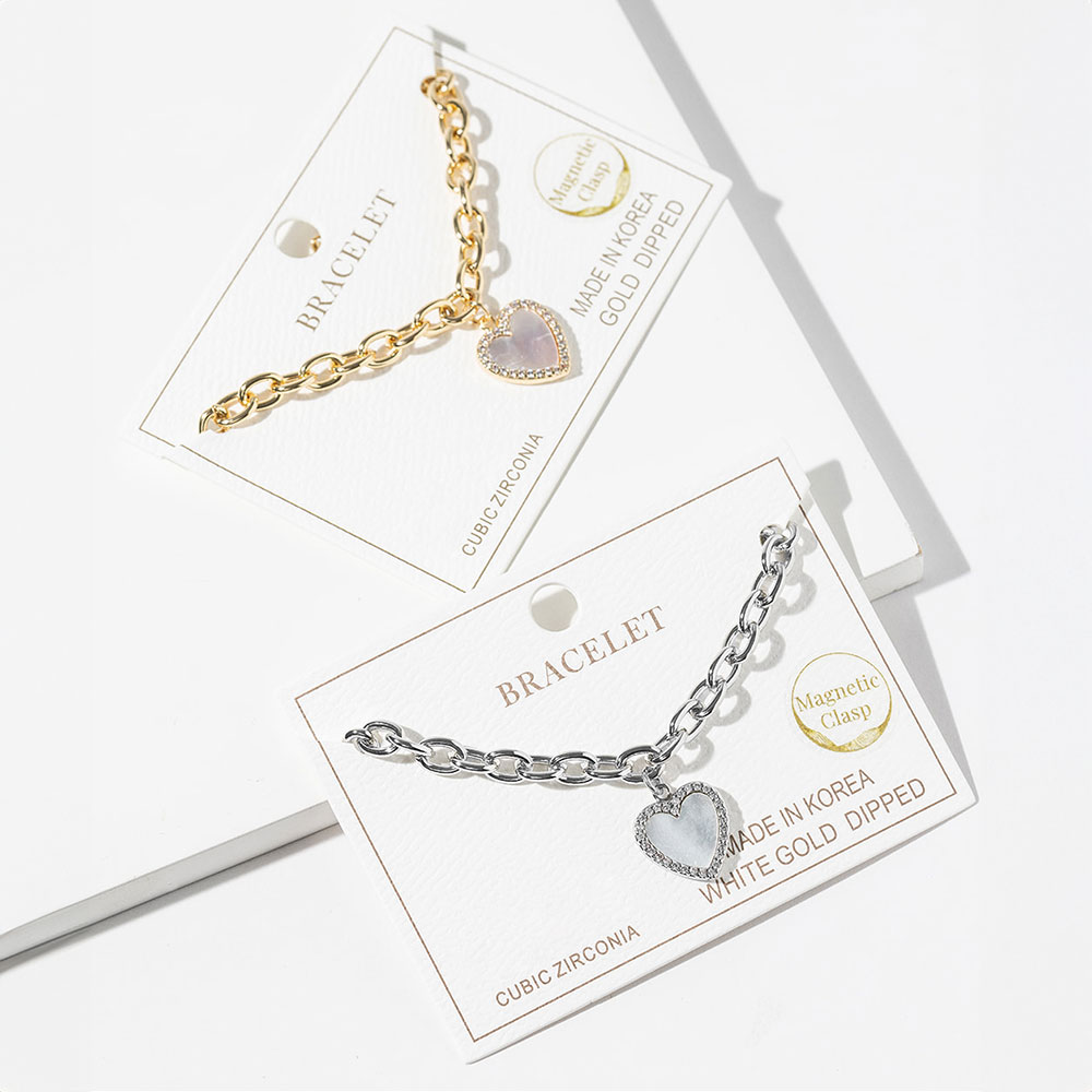 White Gold Dipped CZ Stone Rim Mother of Pearl Heart Charm Magnetic Chain Bracelet