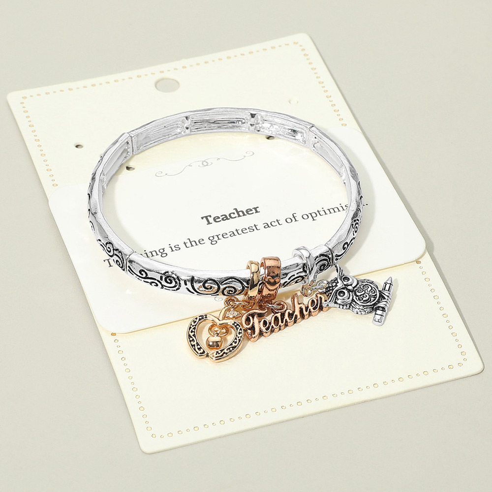 • Honor educators with this Teacher charm bracelet featuring a heartfelt inscription, intricate owl charm, and decorative heart pendant. A meaningful appreciation gift that celebrates teaching as a lasting act of inspiration.
