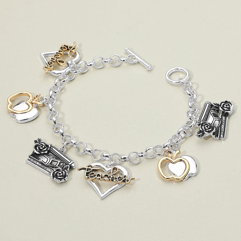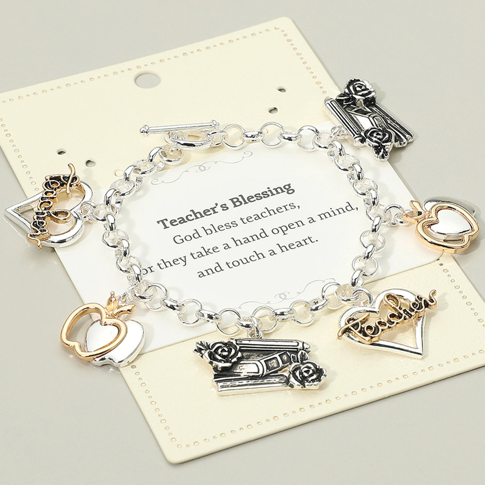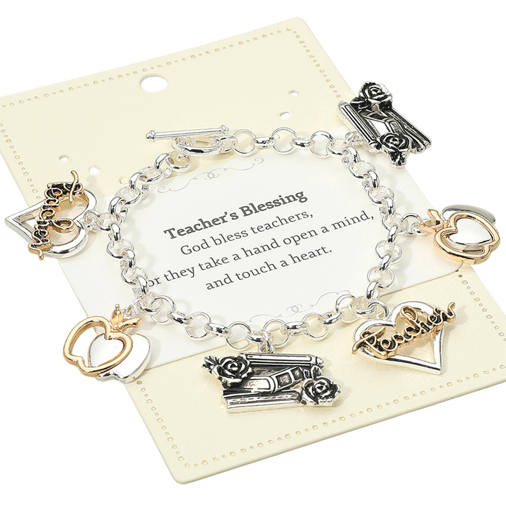 Details • Size : 1" H, 7.5" L • Toggle Closure • Celebrate the dedication of teachers with this Teacher’s Blessing charm bracelet featuring meaningful charms and an uplifting message. A thoughtful accessory that honors their passion and impact, this bracelet is the perfect gift to express gratitude and admiration. • Lead and Nickel Compliant