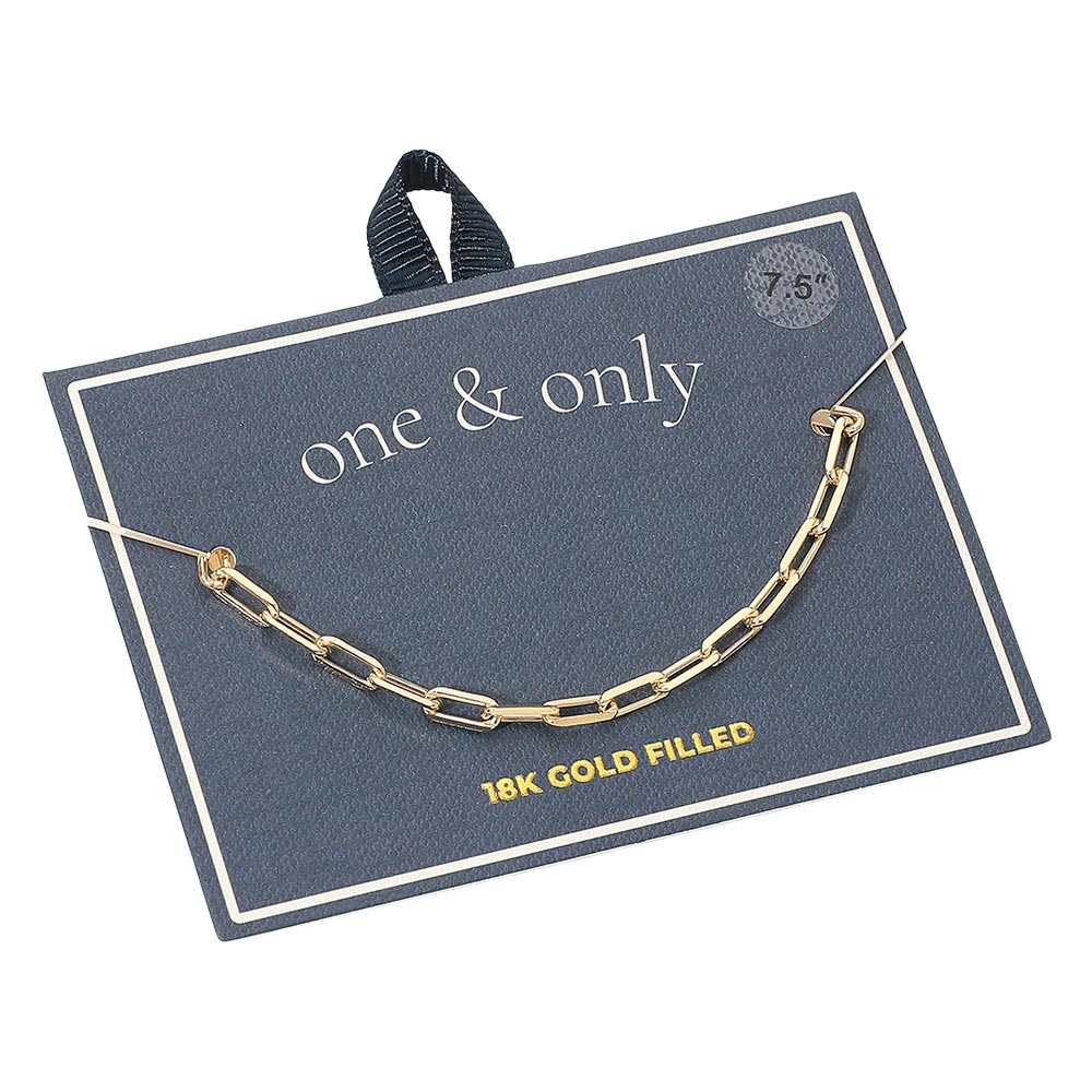 Details • Size : 0.2" H (4mm), 7.5" L • Elegant chain bracelet featuring a minimalist link design for timeless sophistication. Lightweight and versatile, it’s perfect for layering or wearing alone. Presented on a “one & only” card for effortless gifting and everyday elegance. • Lead and Nickel Compliant • Gold Filled • Made In Brazil
