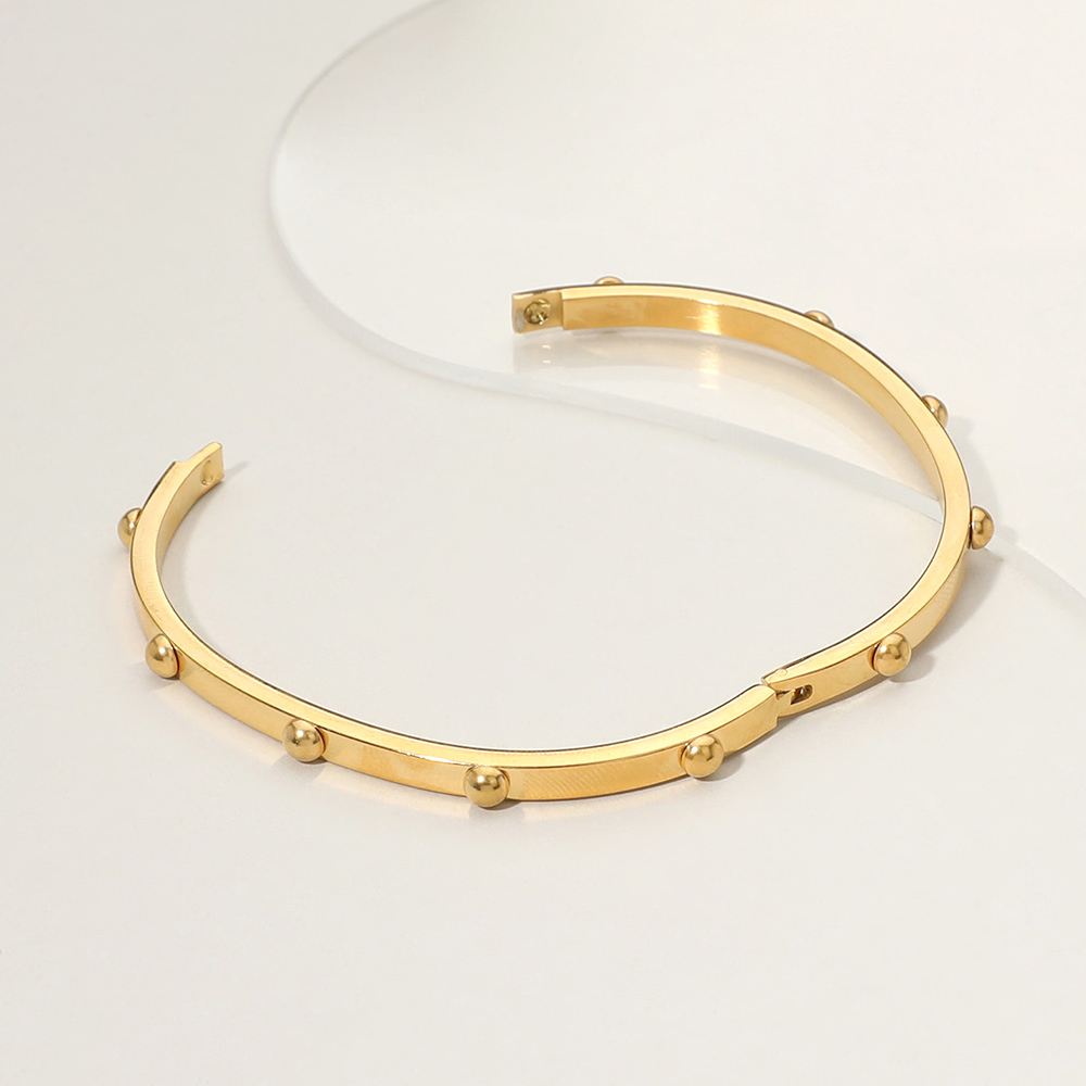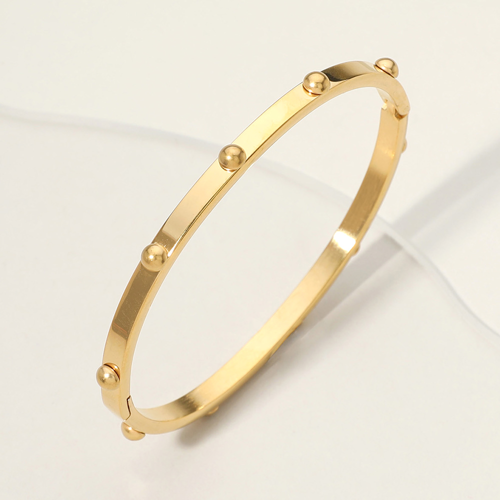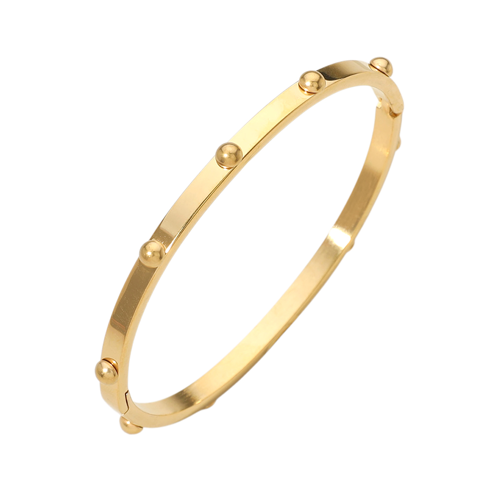 Details • Size : 0.2" H, 2.3" D • Hinged Closure • Modern bangle bracelet featuring a polished finish with subtle stud accents for a stylish edge. Perfect for stacking or wearing solo, this versatile accessory adds sophistication and contemporary flair to both casual and formal outfits. • Stainless Steel
