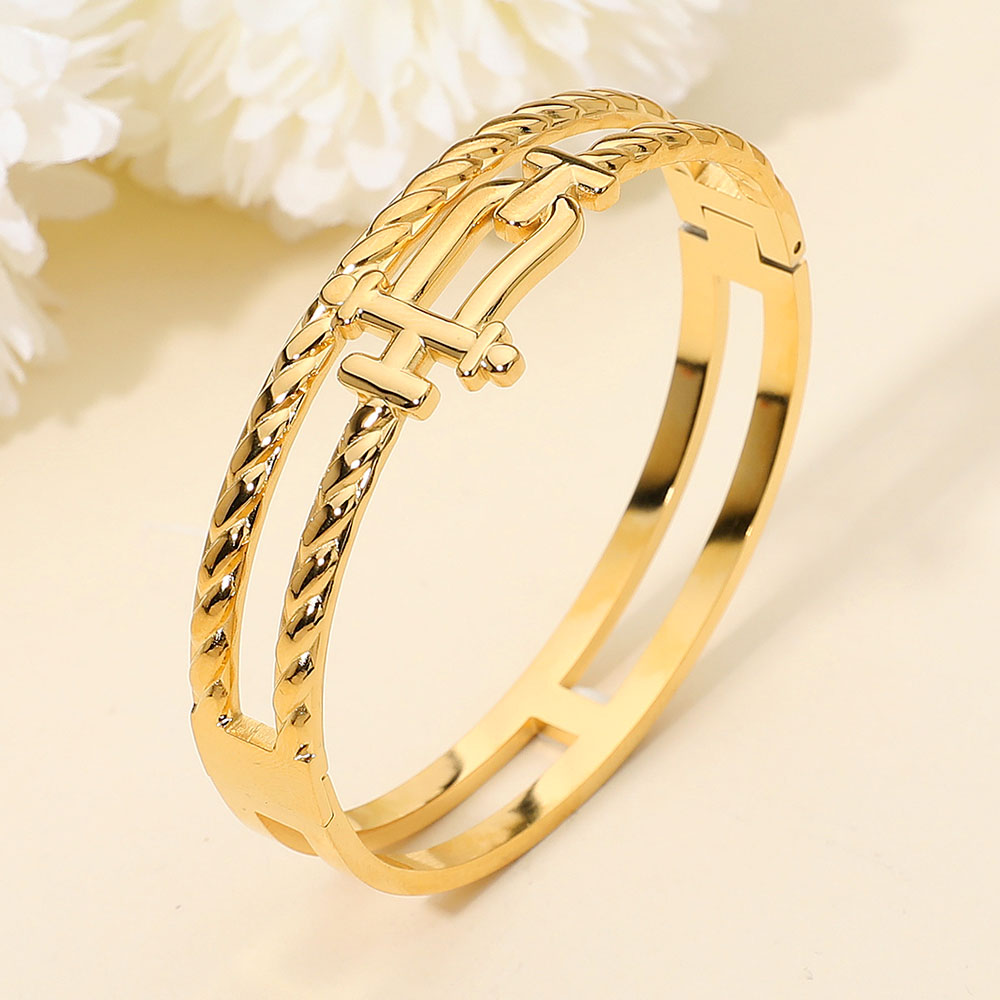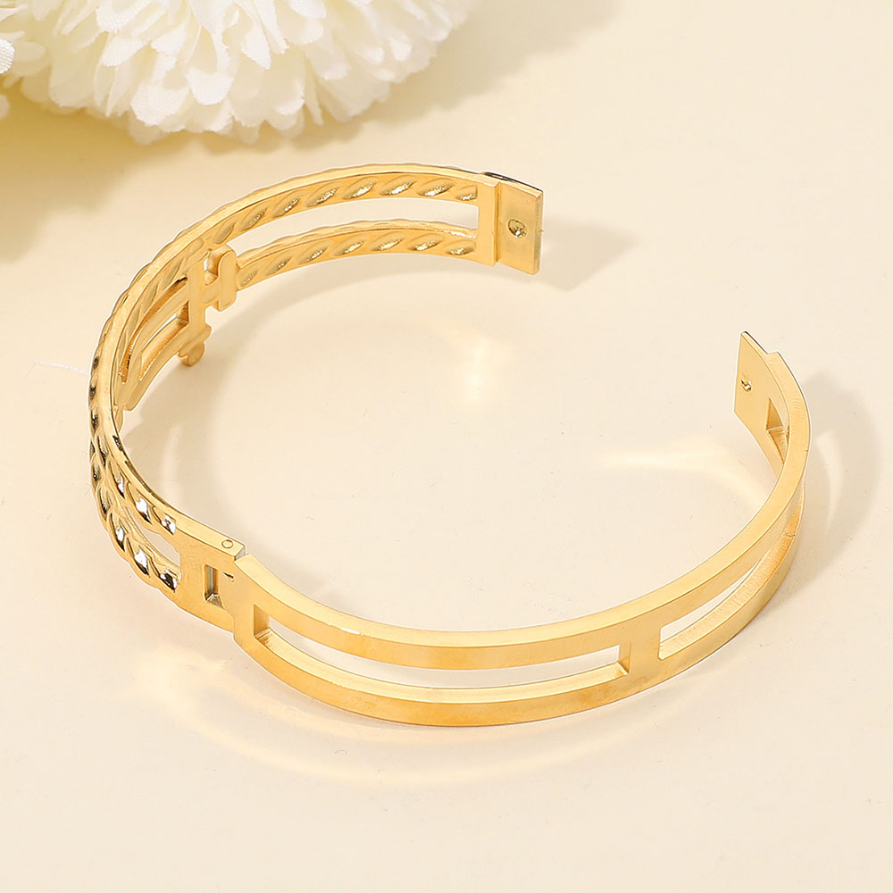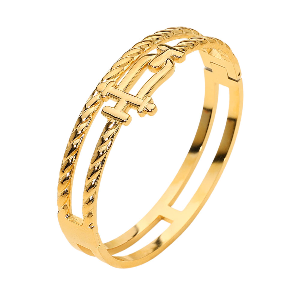 Details • Size : 0.75" H, 2.4" D • Hinged Closure • Water & Tarnish Resistant • Statement hinged bangle showcasing a refined double-chain silhouette with sculpted detailing and a structured clasp design. Crafted for secure, comfortable wear, it layers effortlessly with other pieces or stands alone as a bold accent for everyday looks or elevated styling moments. • Stainless Steel