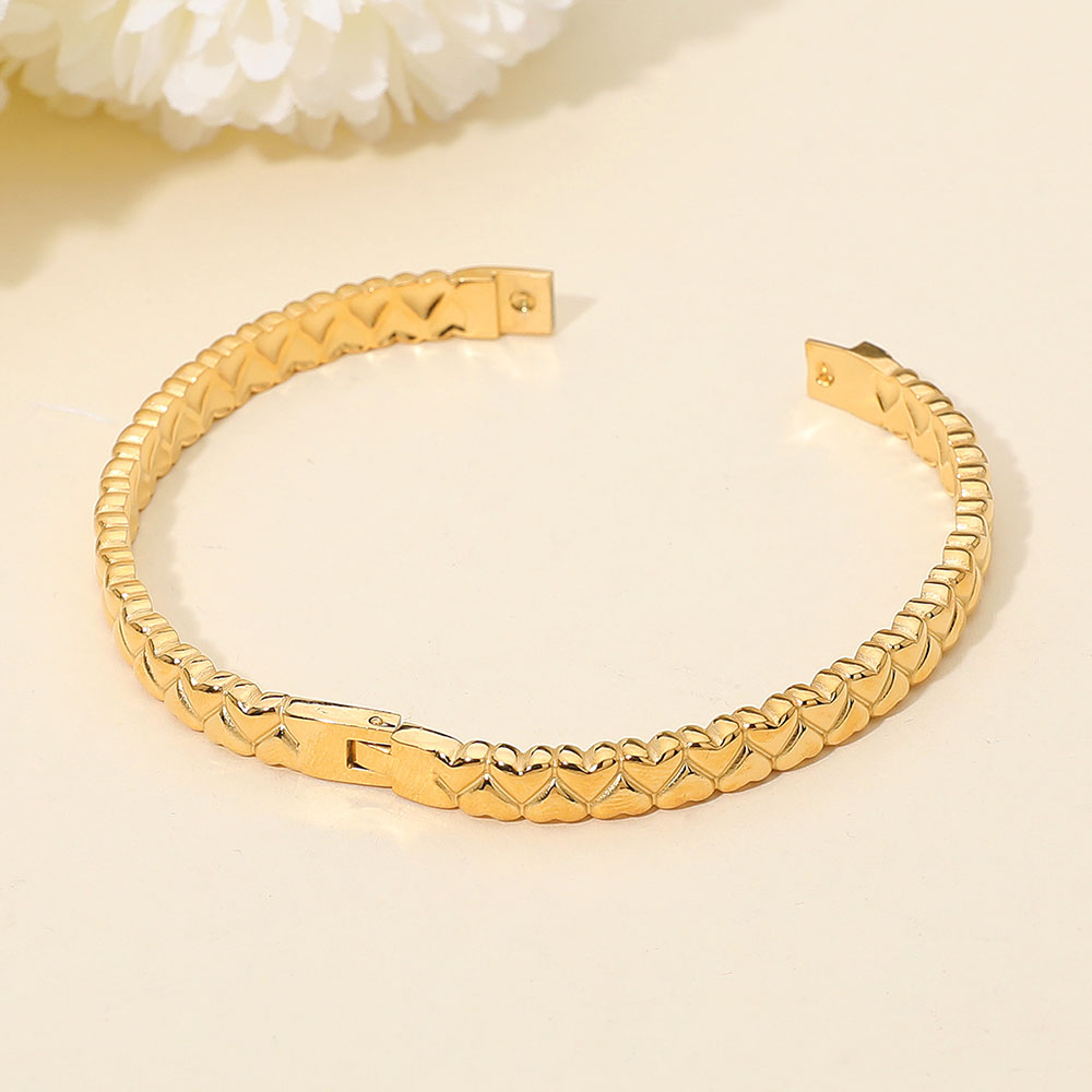 Details • Size : 0.25" H, 2.4" D • Hinged Closure • Water & Tarnish Resistant • Sleek hinged bangle featuring a continuous textured surface that adds dimension and subtle shine to any look. Designed for easy wear and a secure fit, this refined bracelet layers beautifully or stands alone as a modern statement for everyday styling. • Stainless Steel