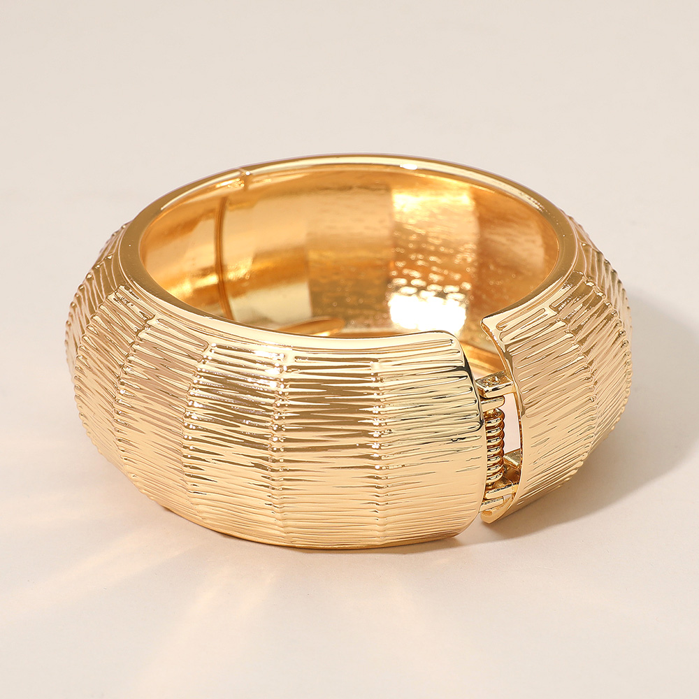 Details • Size : 1.25" H, 2.3" D • Hinged Closure • Make a bold impression with this textured wide bangle bracelet featuring a sleek, eye-catching design. Perfect for elevating casual or dressy outfits, this statement piece adds a touch of modern elegance and sophistication to your accessory collection.