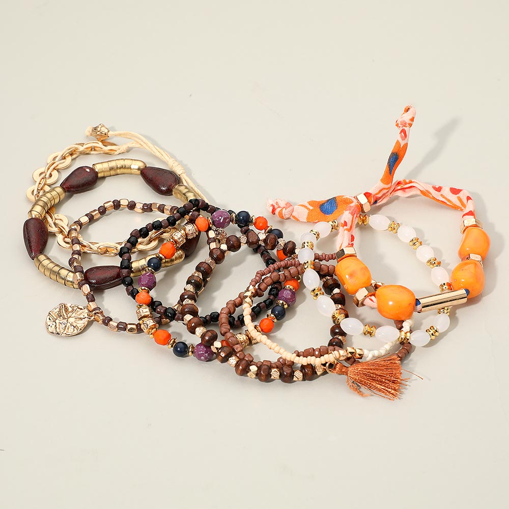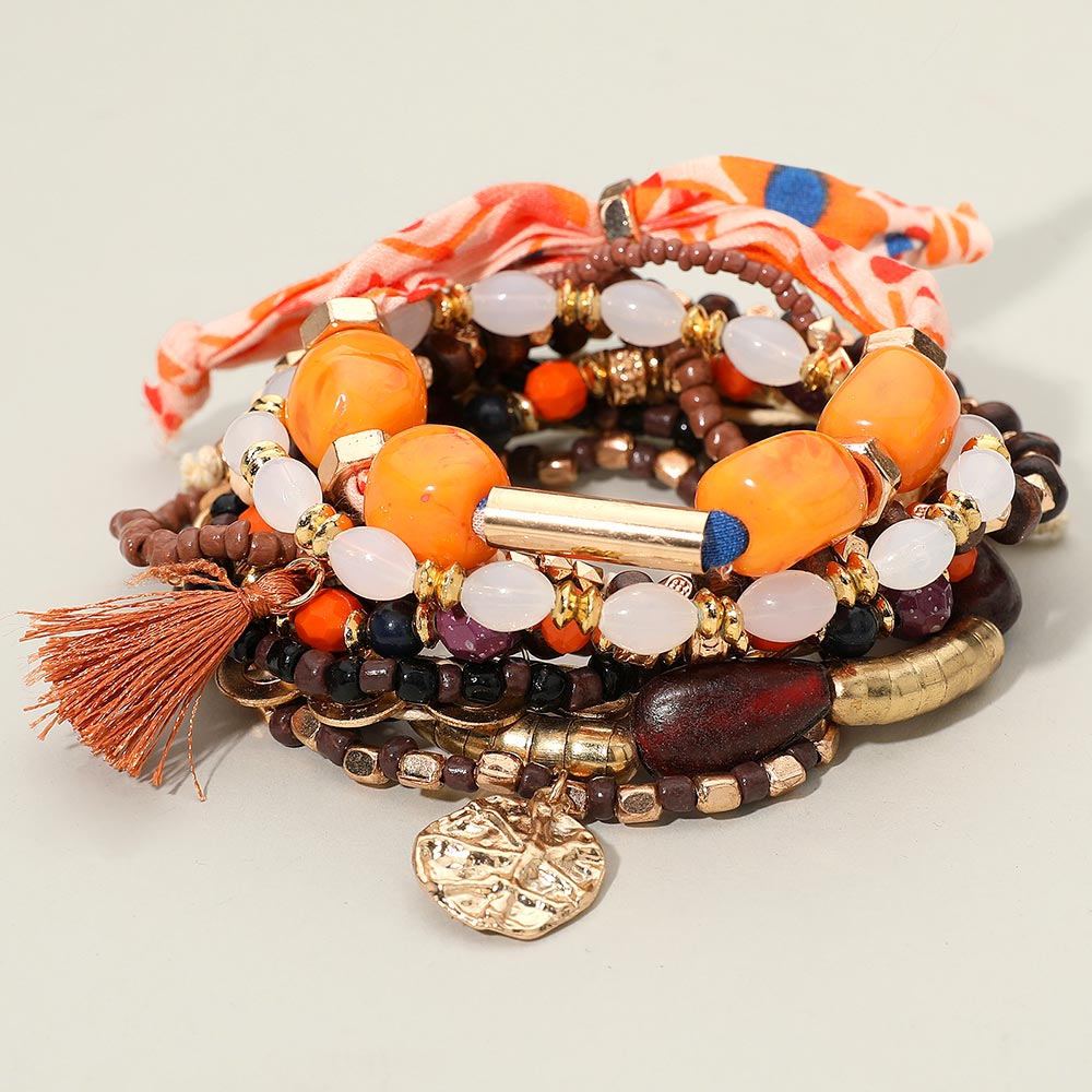 Details • Size 1 : 1.5" H / Stretchable • Size 2 : 0.8" H / Adjustable • Elevate your style with this vibrant boho bracelet stack featuring an eclectic mix of beads, bold accents, playful charms, and a soft fabric tie. Designed for effortless layering, it adds lively detail and artistic flair to everyday looks or standout outfits. • Lead and Nickel Compliant • Made In India