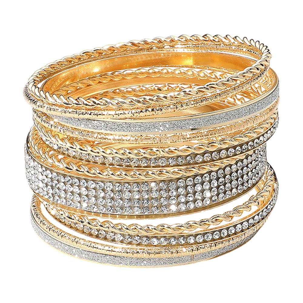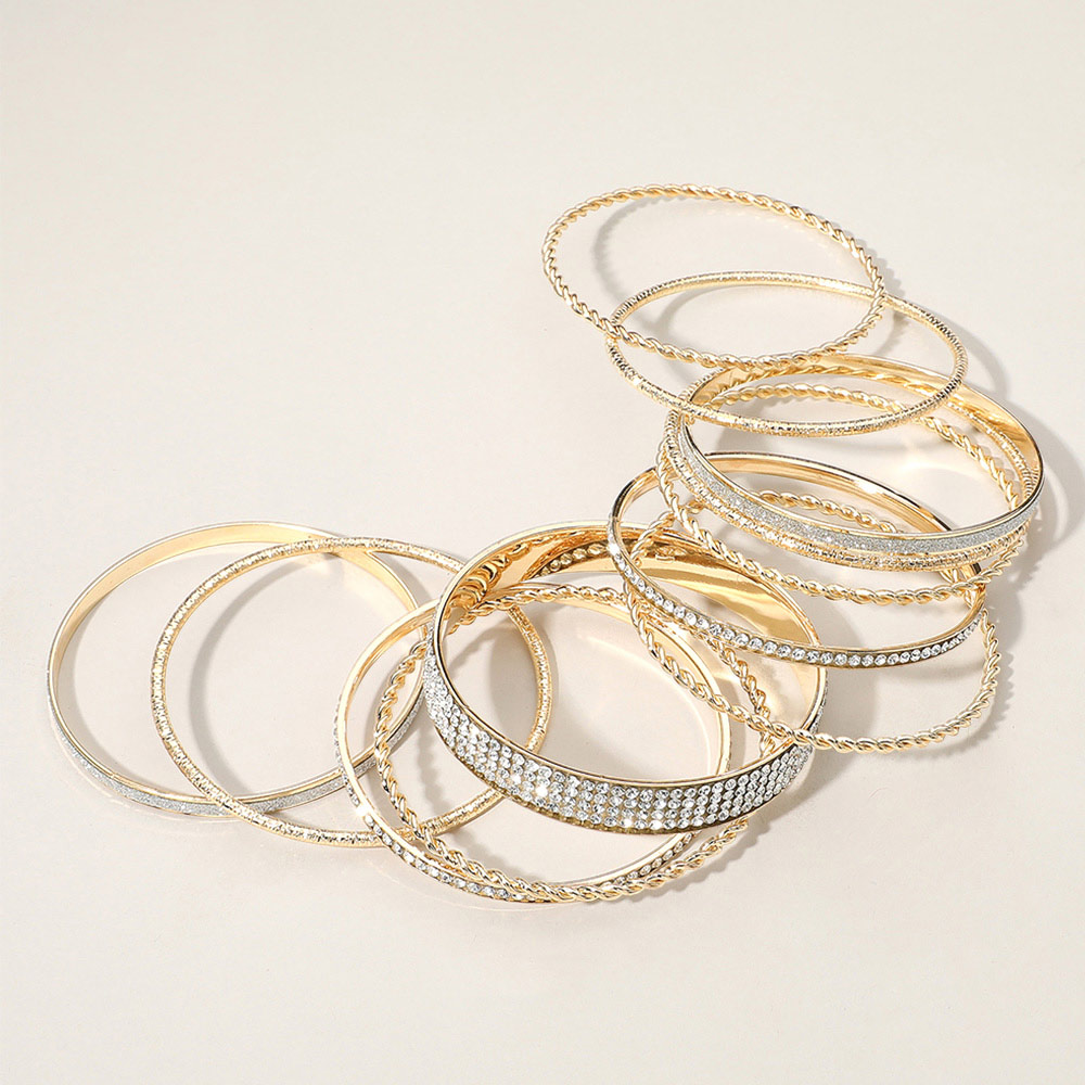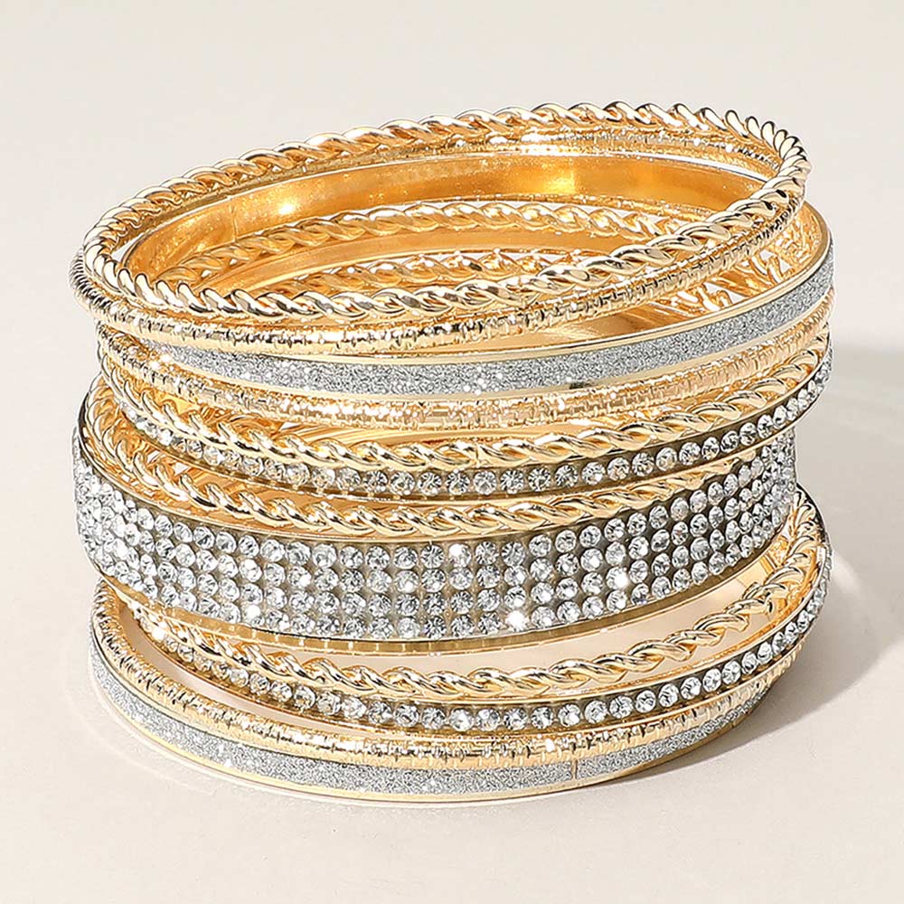 12PCS - Rhinestone Paved Glittered Twisted Textured Metal Bangle Stackable Multi Layered Bracelets