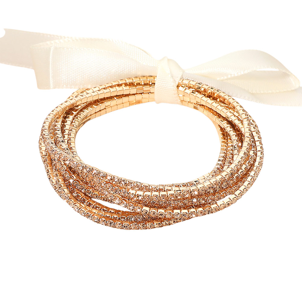 12PCS - Ribbon Slim Rhinestone Stretch Multi Layered Bracelet