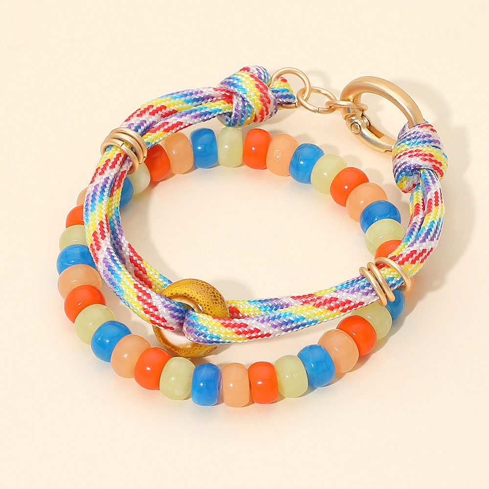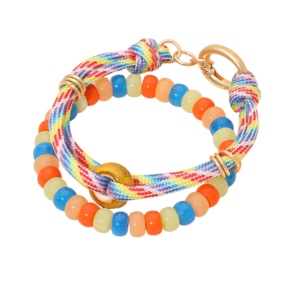 Details • Size 1 : 0.5" H, 8" + 0.75" L / Lobster Clasp Closure • Size 2 : 0.3" H / Stretchable • This beaded rainbow rope bracelet brings playful energy to any look with its vibrant mix of textures and lively accents. Designed for easy, everyday wear, it adds a fun pop of personality whether worn solo or stacked, making it a cheerful accessory for any casual style. • Lead and Nickel Compliant