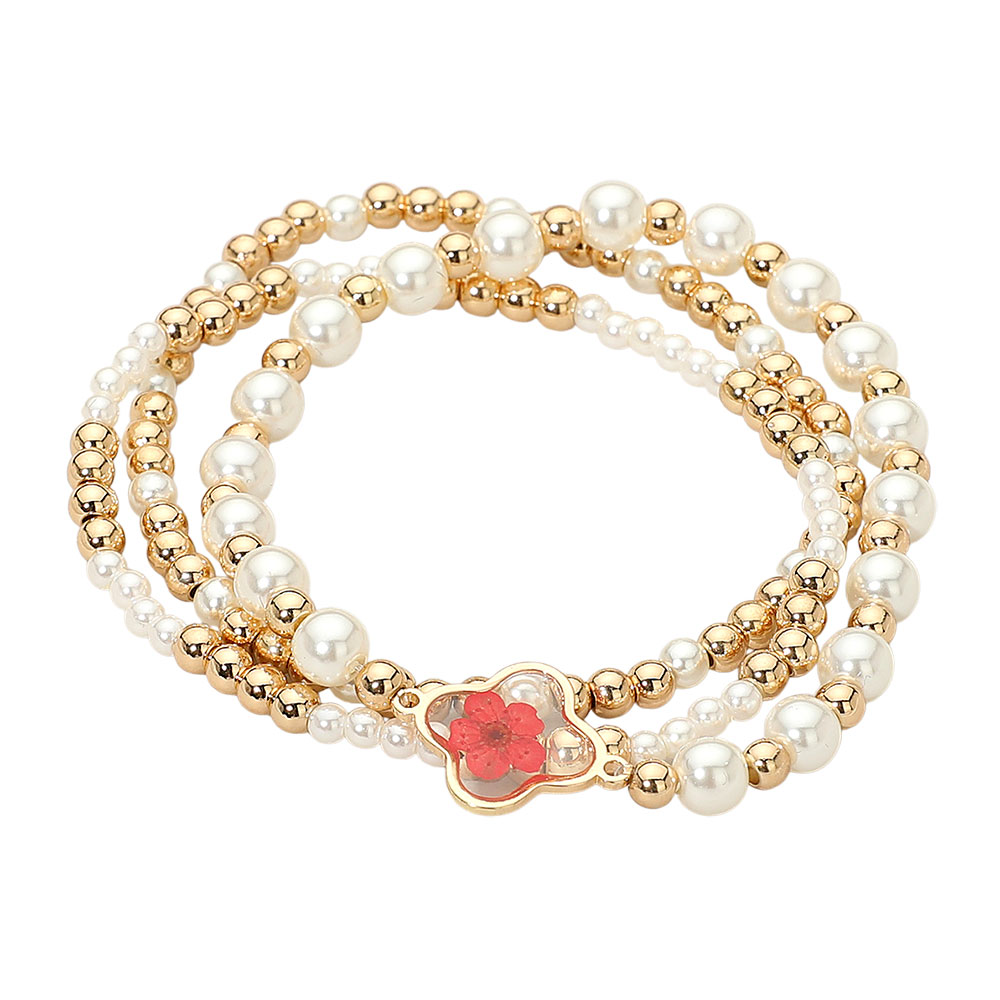 3PCS - Floral Accent Pearl Metal Ball Beaded Stretch Multi Layered Bracelets