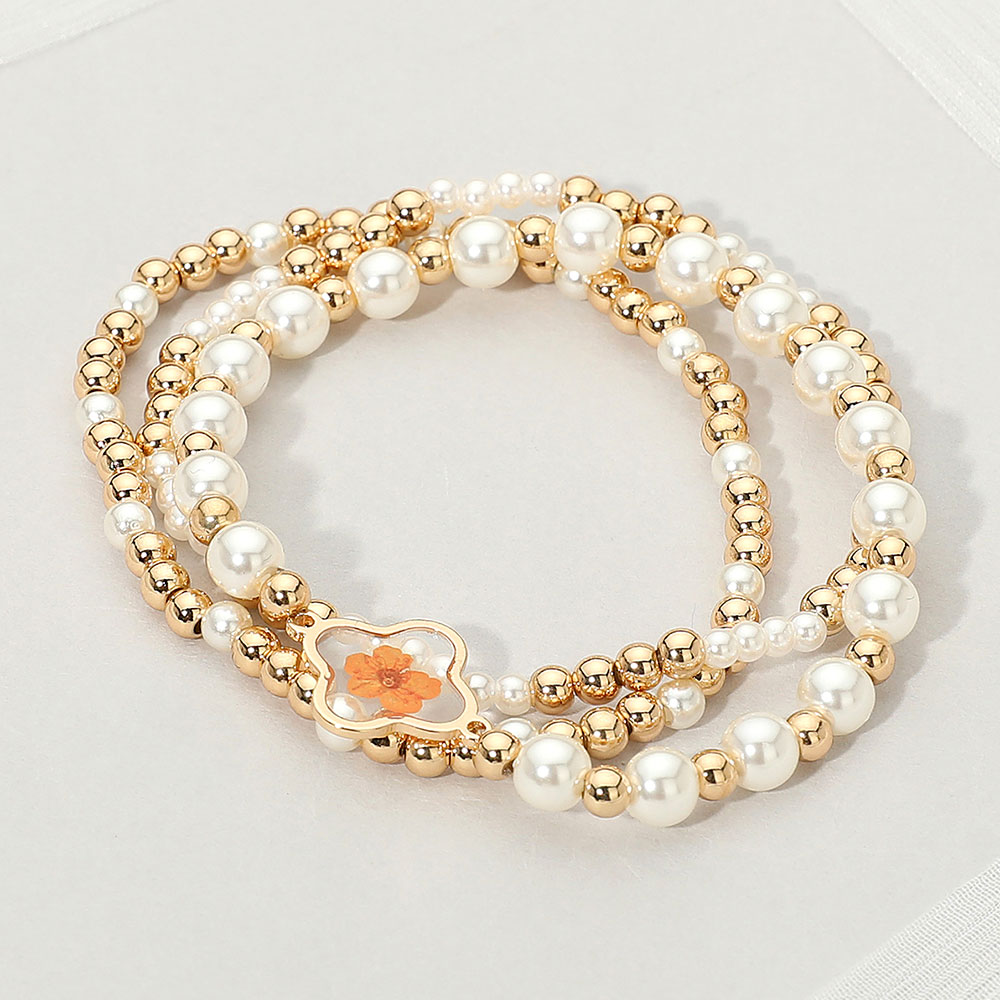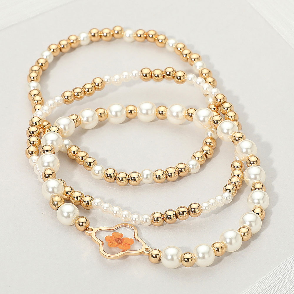 3PCS - Floral Accent Pearl Metal Ball Beaded Stretch Multi Layered Bracelets