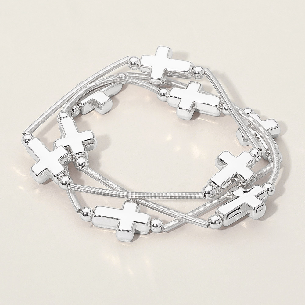 Details • Size : 1.25" H • Stretchable • A stylish multi-strand bracelet set featuring sleek cross charms arranged along flexible bands for an easy, layered look. Lightweight and versatile, it adds modern flair to casual or dressed-up outfits, making it a meaningful accessory that pairs effortlessly with any personal style. • Lead and Nickel Compliant