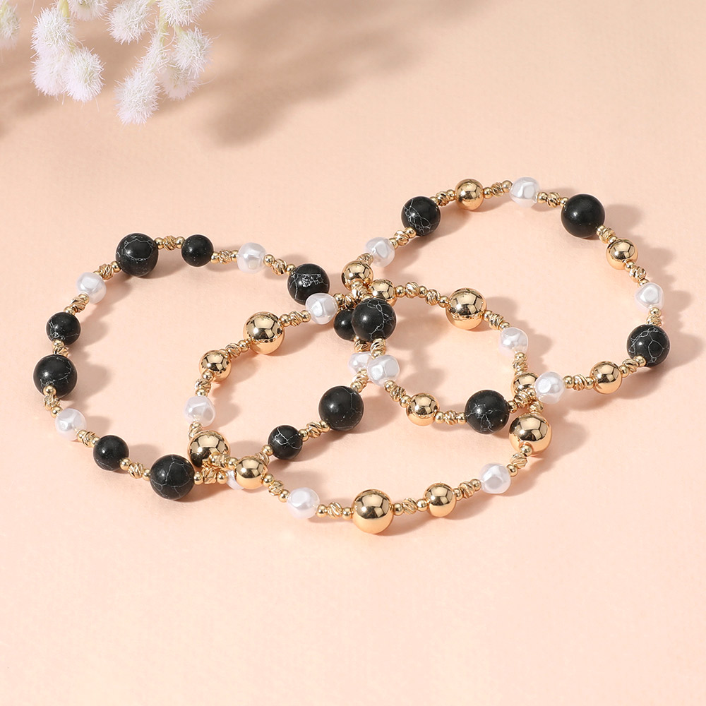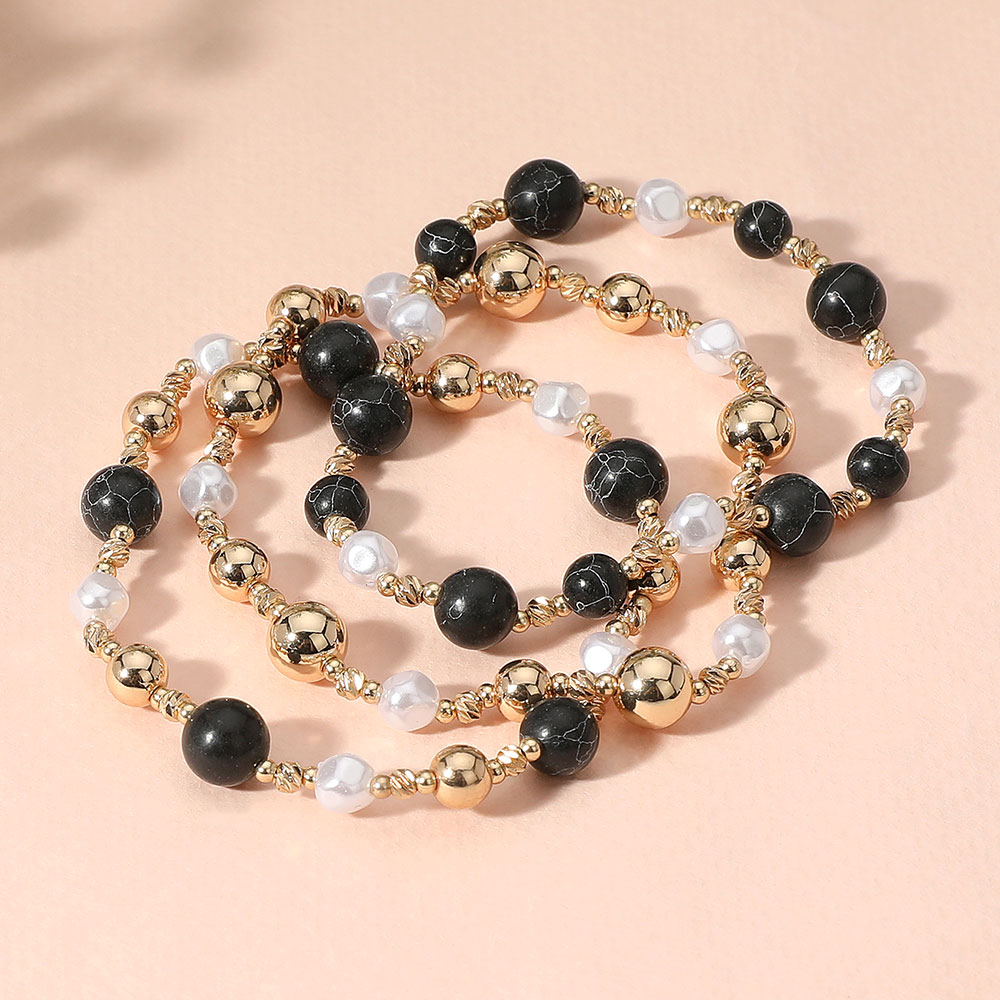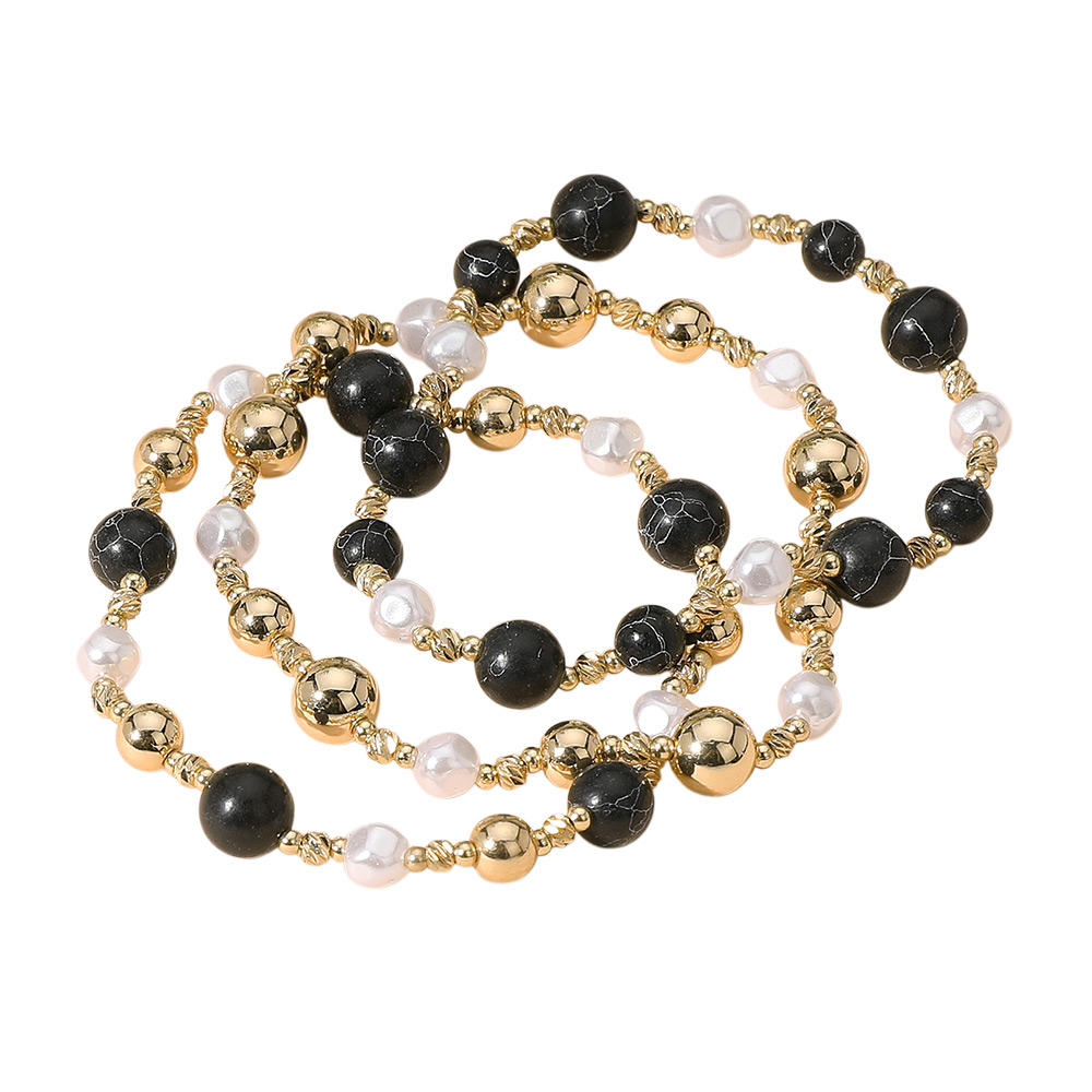 3PCS - Natural Stone Metal Ball Pearl Beaded Stretch Multi Layered Bracelets