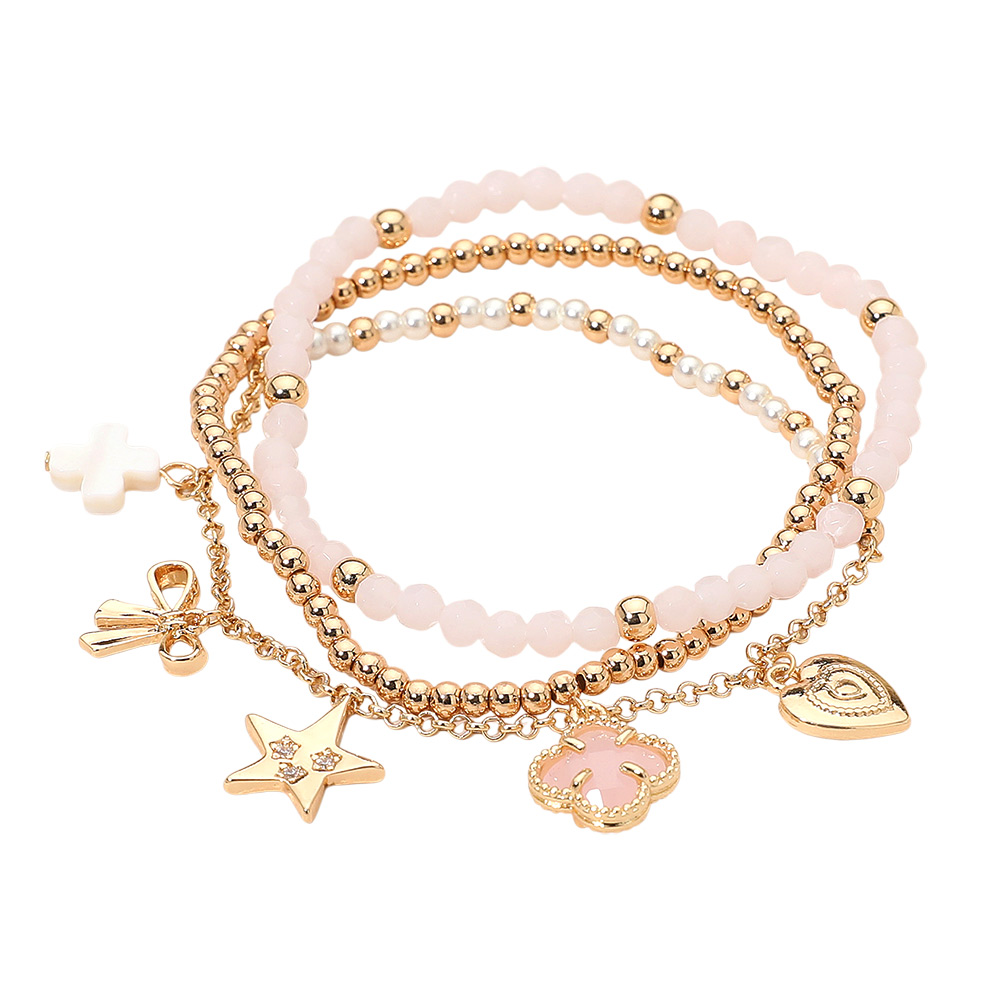 3PCS - Quatrefoil Bow Heart Cross Charm Pearl Metal Ball Faceted Beaded Stretch Multi Layered Bracelets