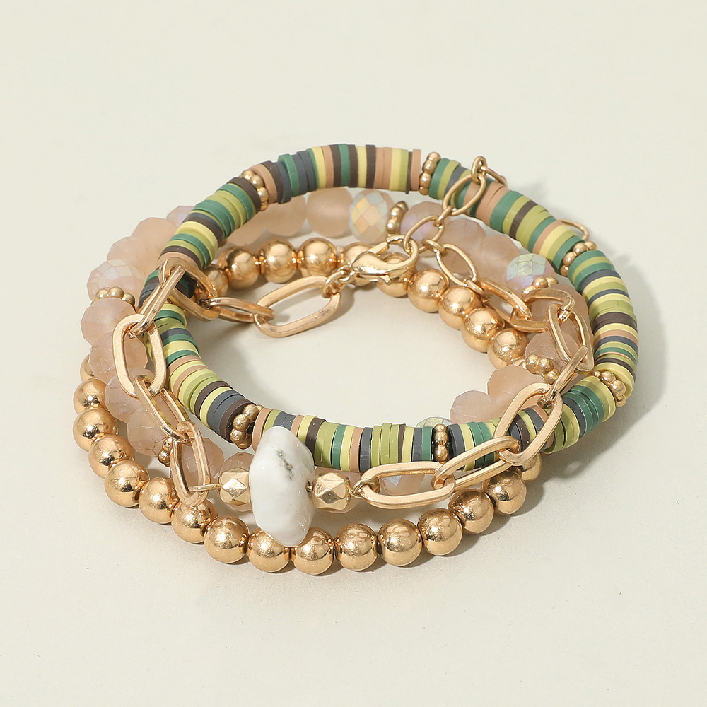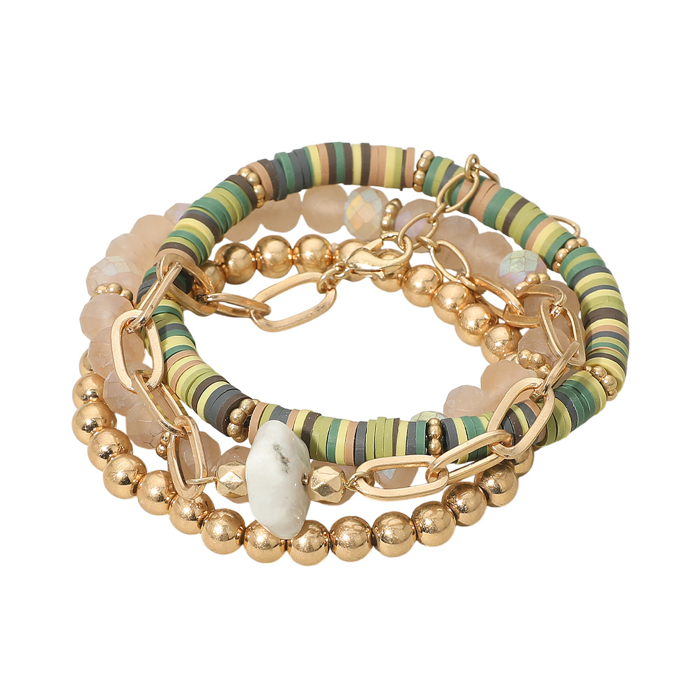 • Make a bold statement with this layered bracelet set combining smooth beads, colorful accents, chain details, and a unique stone centerpiece. Its playful yet chic design offers versatility, perfect for stacking or wearing alone to complement everyday and special occasion outfits.