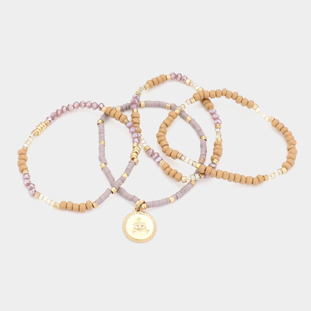 4PCS - Rhinestone Evil Eye Metal Round Charm Heishi Wood Faceted Beaded Stretch Bracelets
