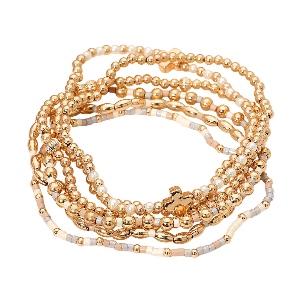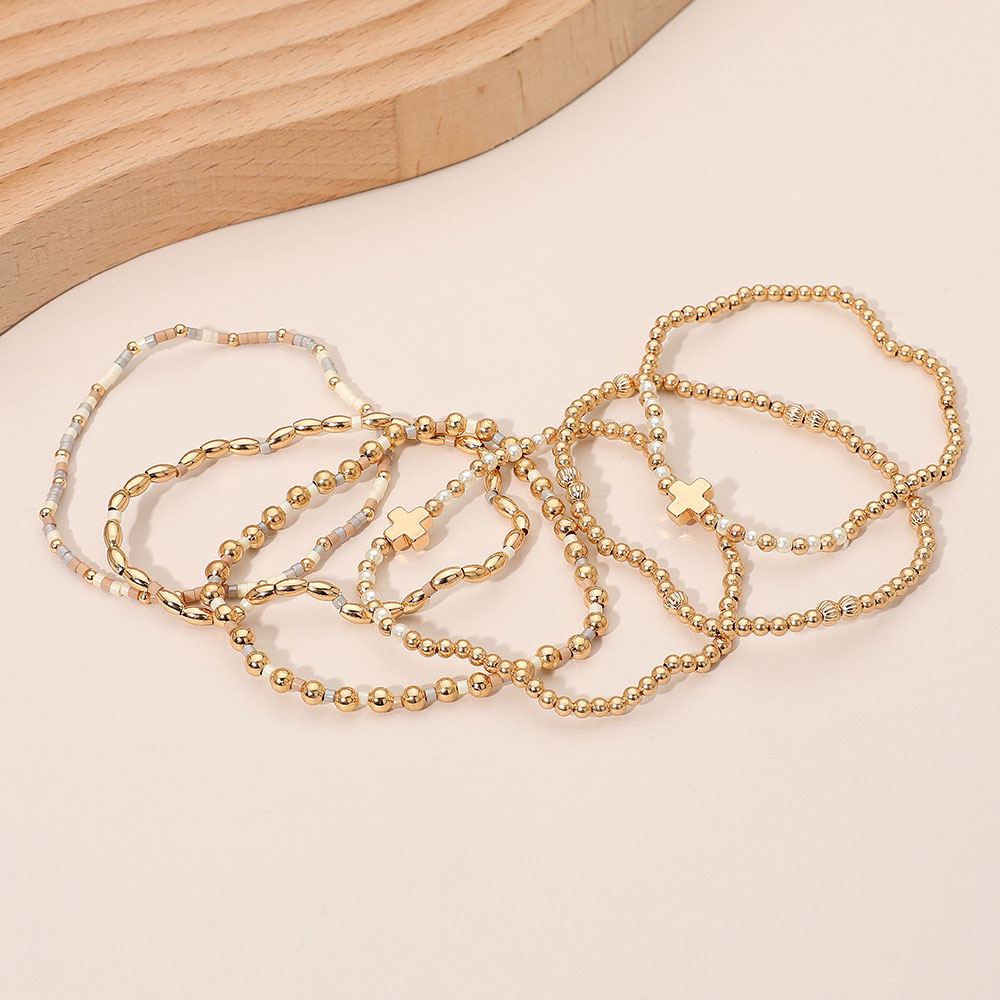 6PCS - Cross Charm Accent Seed Beaded Stretch Multi Layered Bracelets