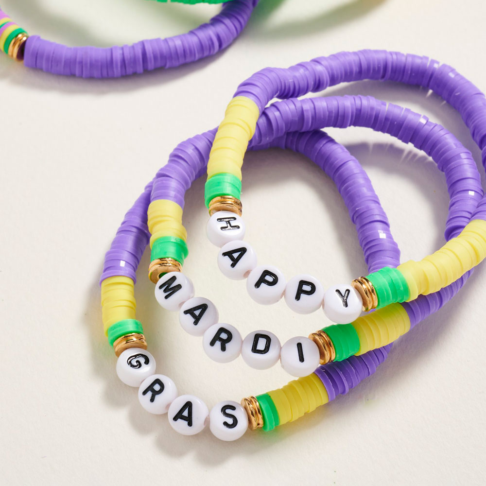 Details • Size : 1.5" H • Stretchable • This Mardi Gras beaded stretch bracelet set features festive letter accents and playful round beads for a lively, celebratory look. Perfect for parties, parades, or casual fun, these easy-to-wear bracelets bring cheerful charm and vibrant personality to any ensemble. • Lead and Nickel Compliant