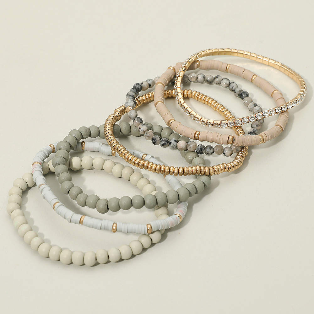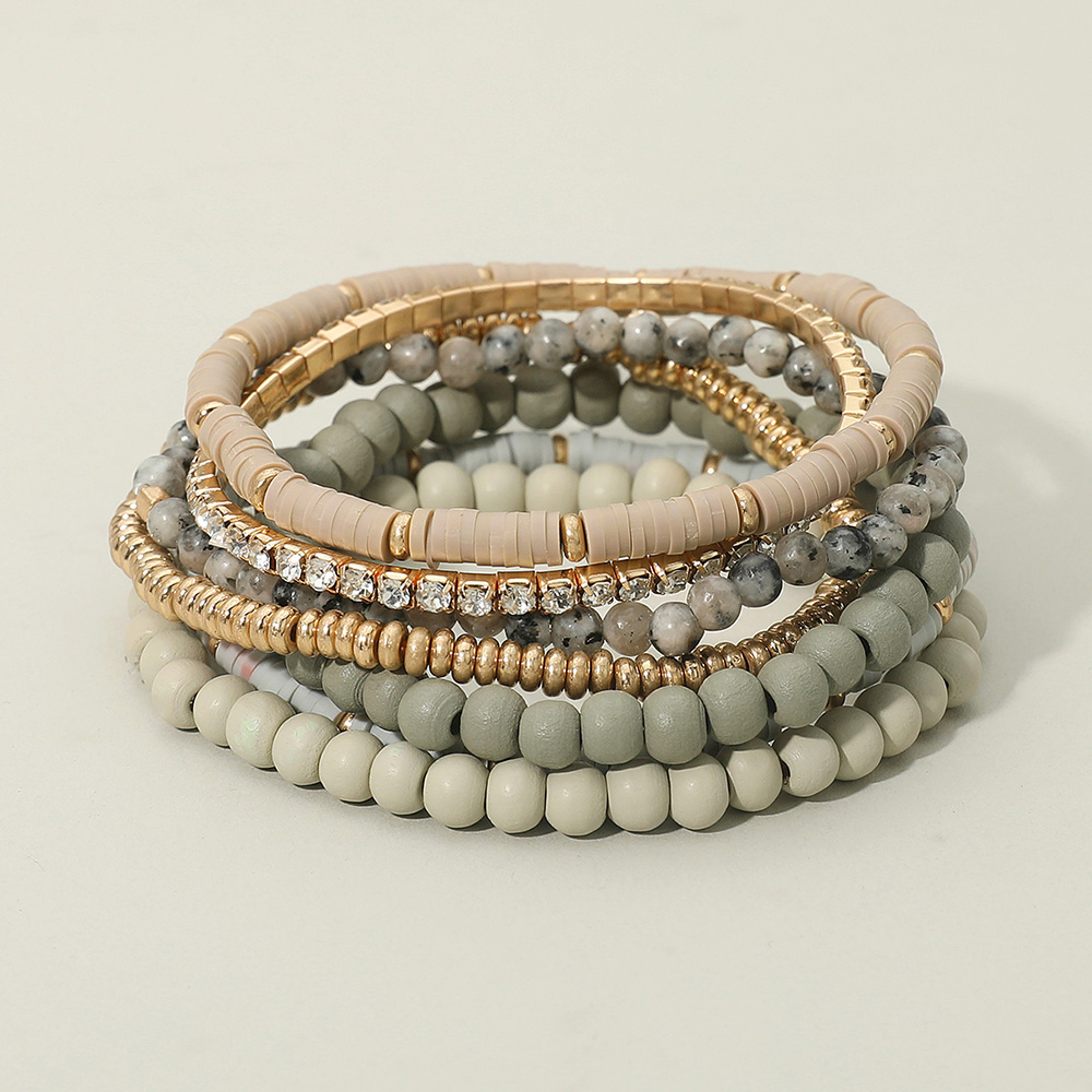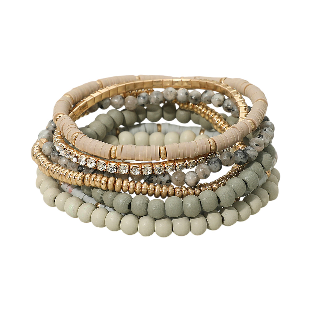 Details • Size : 1.3" H • Stretchable • This multi-strand stretch bracelet set combines a mix of smooth beads, metallic accents, and shimmering details for a stylish layered look. Easy to slip on, it offers comfort and versatility, making it perfect for stacking or wearing alone as a bold statement accessory. • Lead and Nickel Compliant