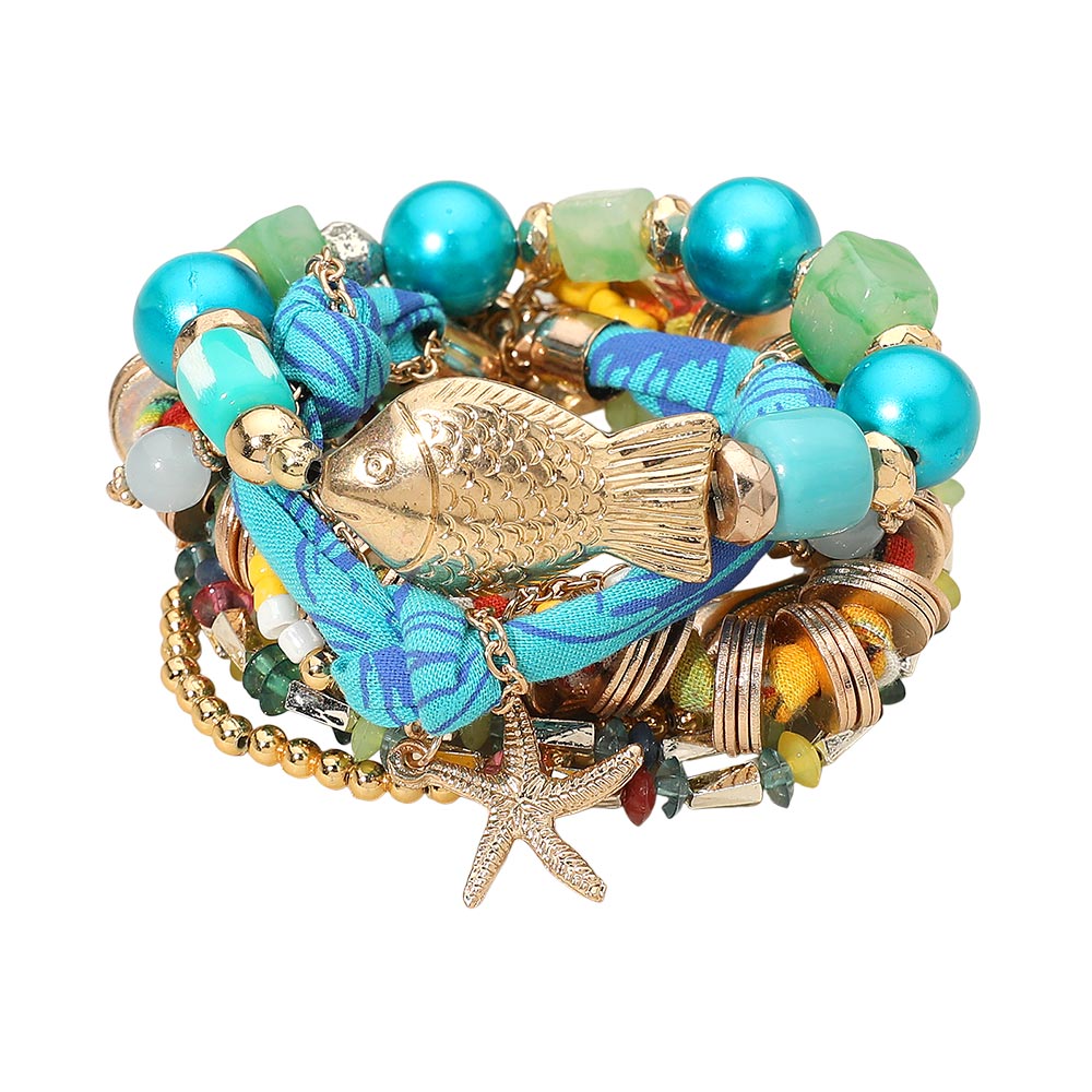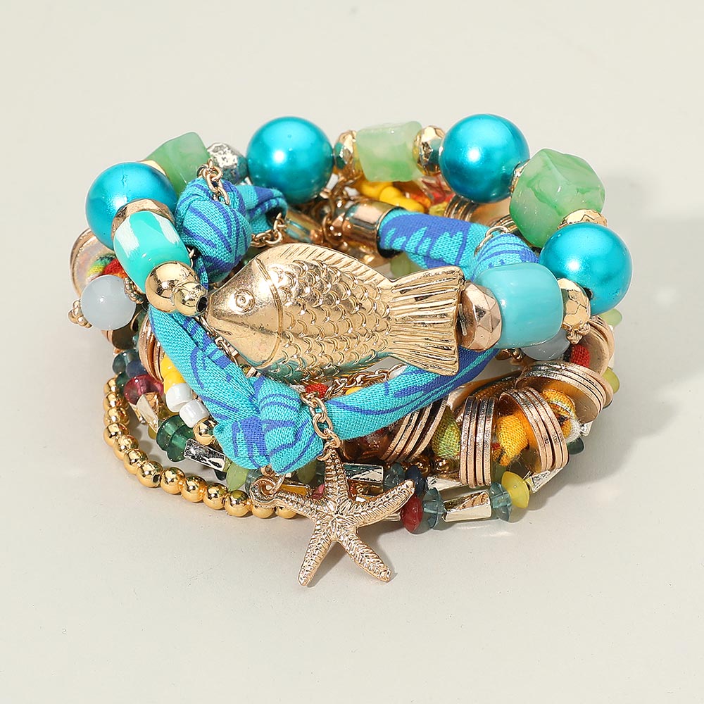 Details • Size 1 : 1.5" H / Stretchable • Size 2 : 0.5" H, 8" L / Lobster Clasp Closure • Size 3 : 0.5" H, 8" + 2" L / Lobster Clasp Closure • Discover a vibrant boho bracelet set featuring layered beads, patterned fabric details, and coastal-inspired charms. This playful stack offers standout texture and artistic appeal, perfect for adding a unique, free-spirited touch to everyday looks or beach-ready styles. • Lead and Nickel Compliant • Made In India
