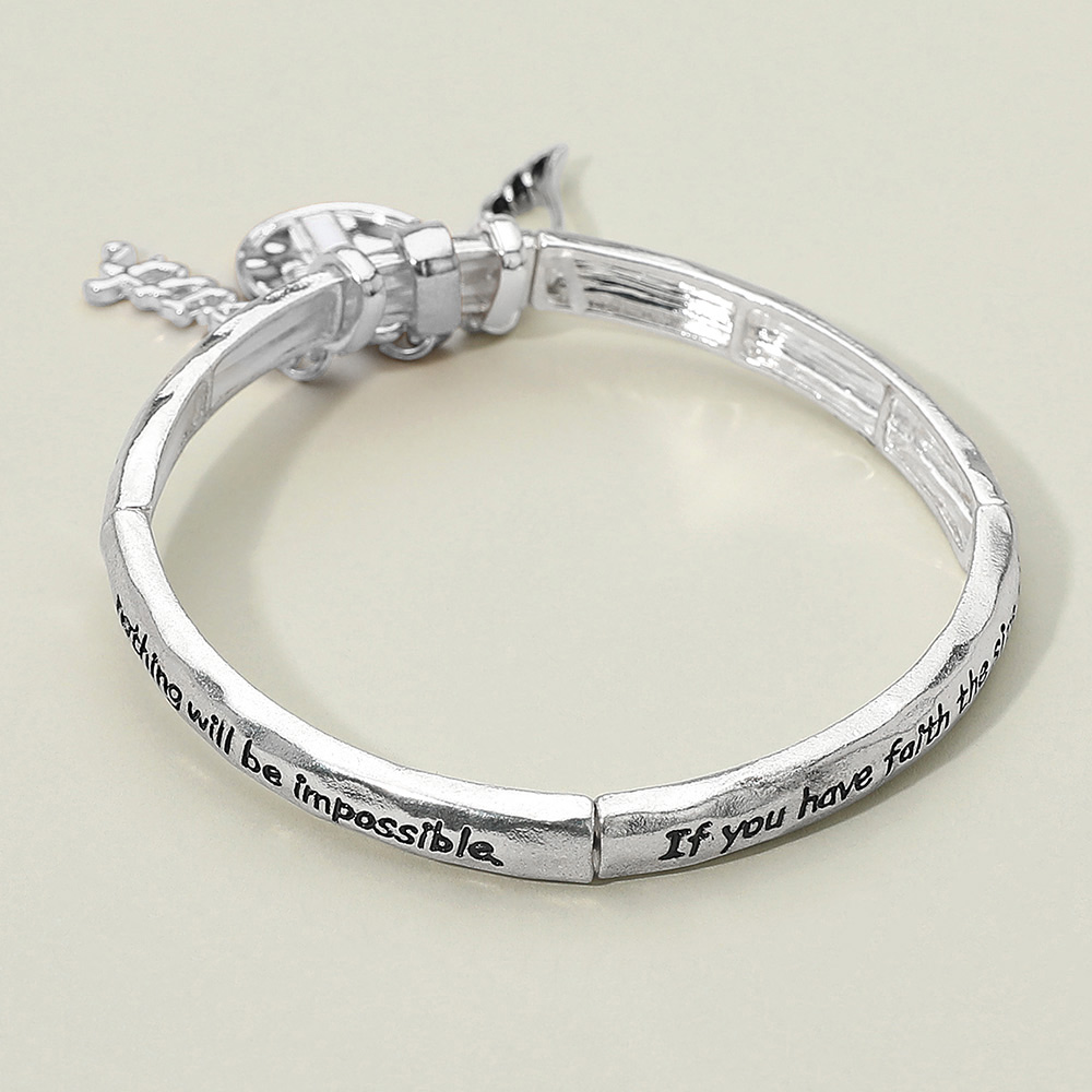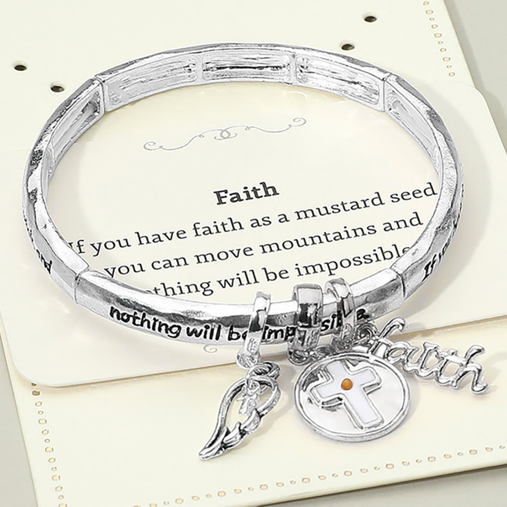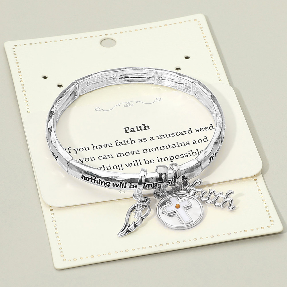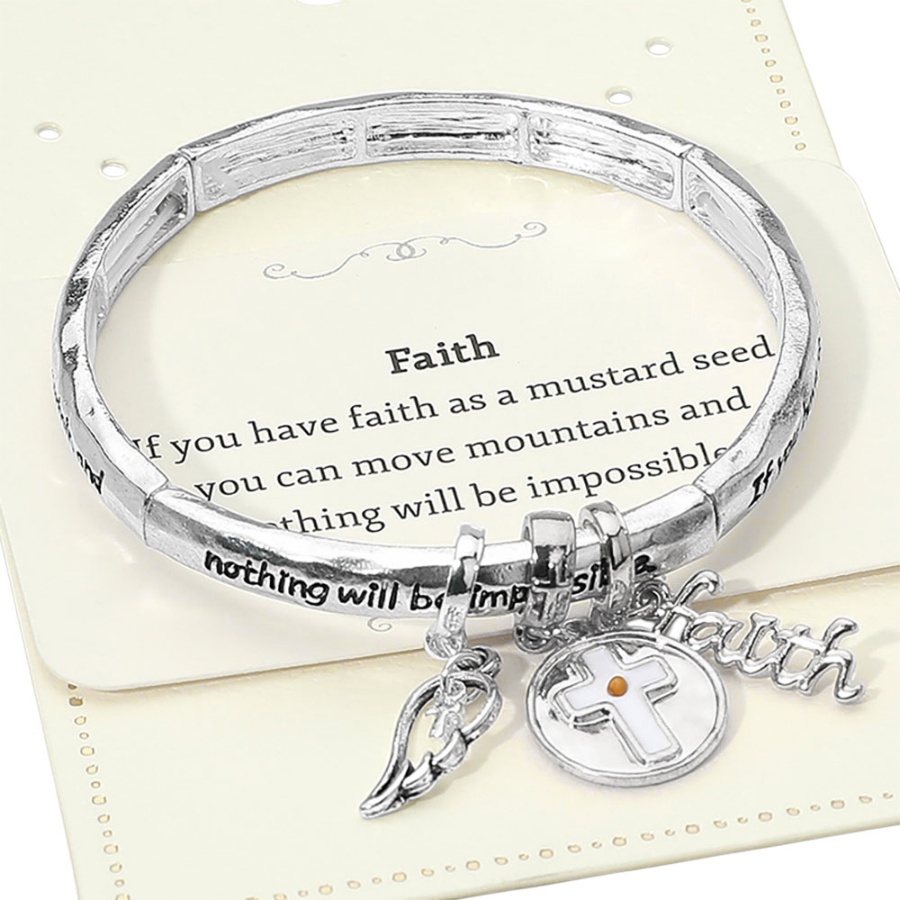 Details • Size : 1.25" H • Stretchable • Celebrate hope and belief with this elegant faith charm bracelet featuring inspirational engravings and symbolic pendants. A meaningful accessory designed to inspire and uplift, perfect for everyday wear or as a thoughtful gift for someone special. • Lead and Nickel Compliant
