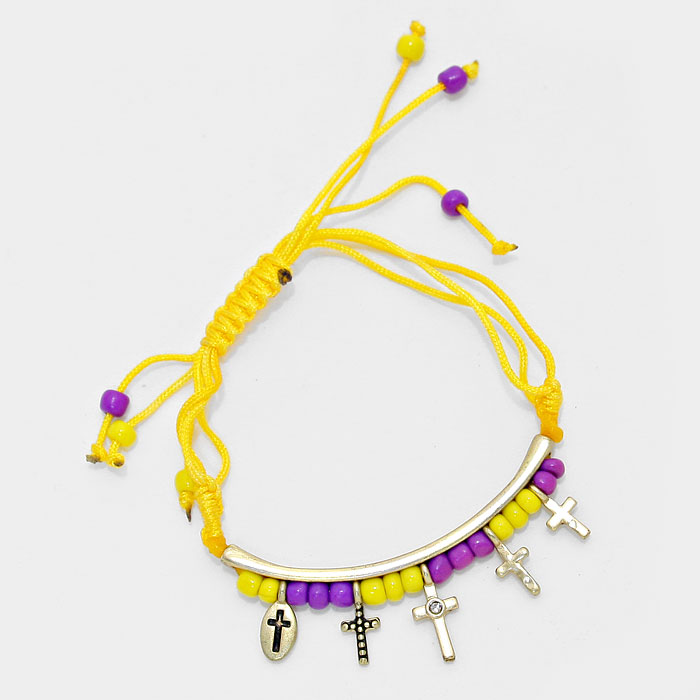 Stone Paved Cross Charm Beaded Thread Adjustable Cinch Pull Tie Bracelet
