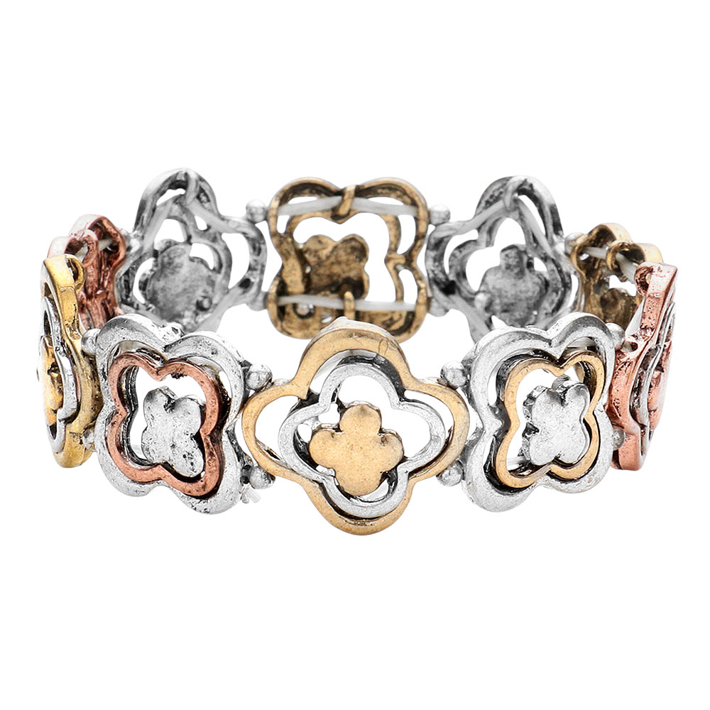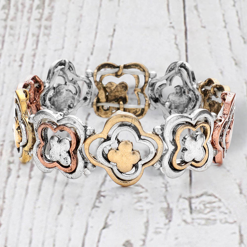 Details • Size : 0.75" H • Stretchable • Add a refined touch to your style with this geometric quatrefoil stretch bracelet. Featuring interlocking quatrefoil shapes, it blends modern artistry with timeless elegance, offering a comfortable fit perfect for casual or sophisticated looks alike. • Lead and Nickel Compliant