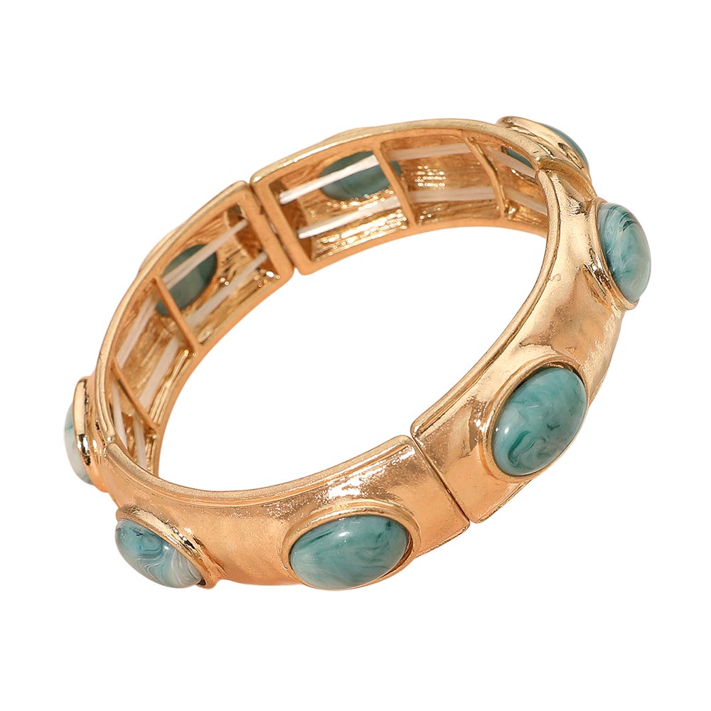 • This textured stretch bracelet is adorned with oval cabochon-style accents, giving it a bold and artistic appeal. Designed for comfort and easy wear, it’s a versatile piece that adds a touch of statement style to both casual and dressy outfits.