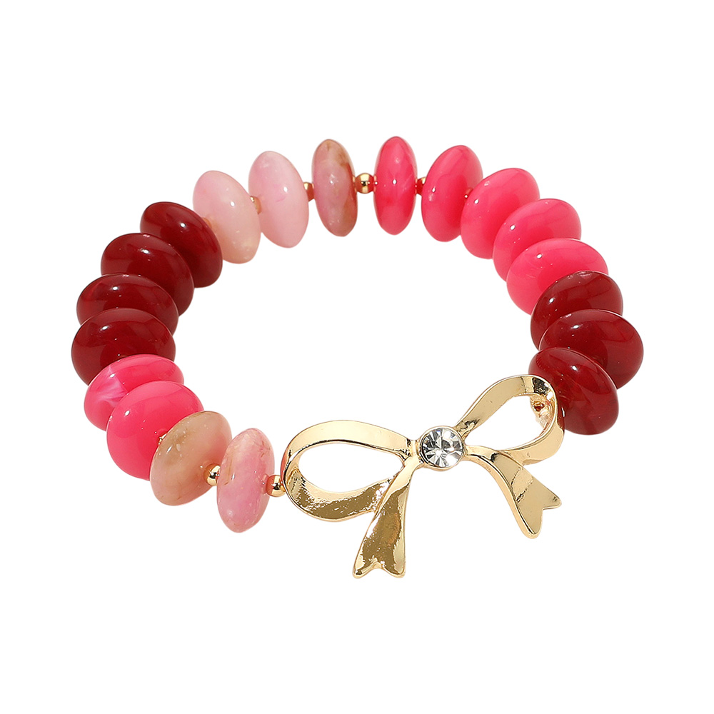Details • Size : 1" H • Stretchable • Charming beaded stretch bracelet featuring glossy round beads in vibrant tones and a gold bow charm with crystal detail. A stylish accessory that adds a playful yet elegant touch to everyday outfits or special looks. • Lead and Nickel Compliant