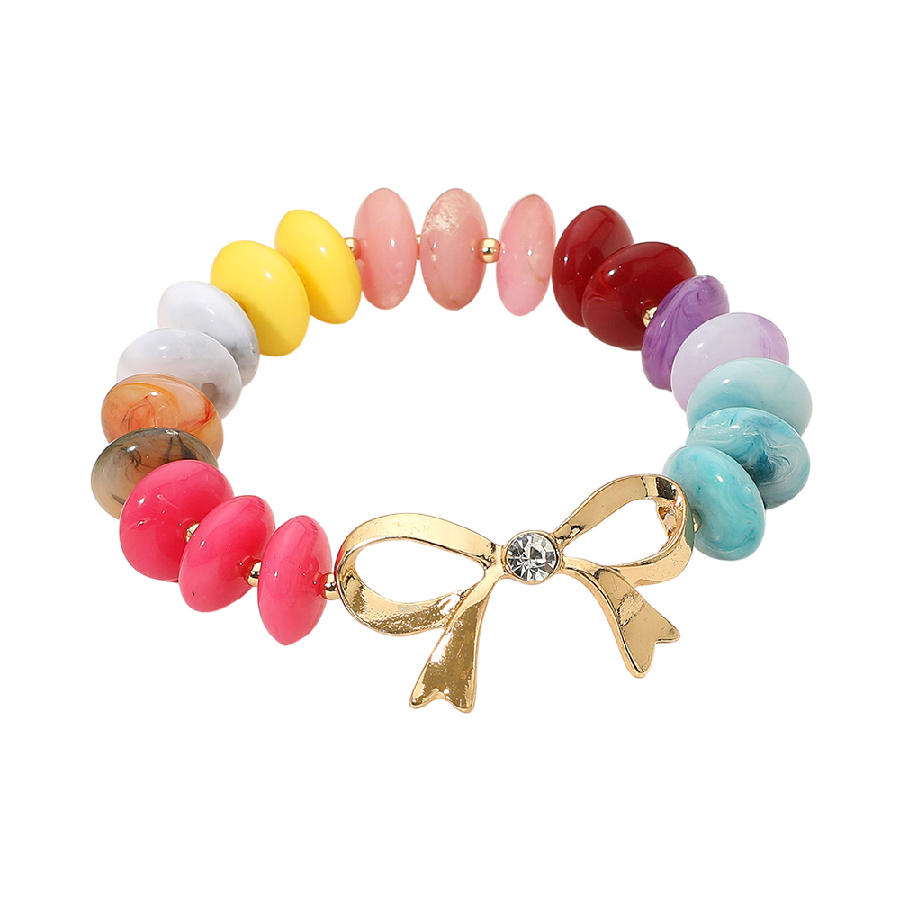 Details • Size : 1" H • Stretchable • Charming beaded stretch bracelet featuring glossy round beads in vibrant tones and a gold bow charm with crystal detail. A stylish accessory that adds a playful yet elegant touch to everyday outfits or special looks. • Lead and Nickel Compliant