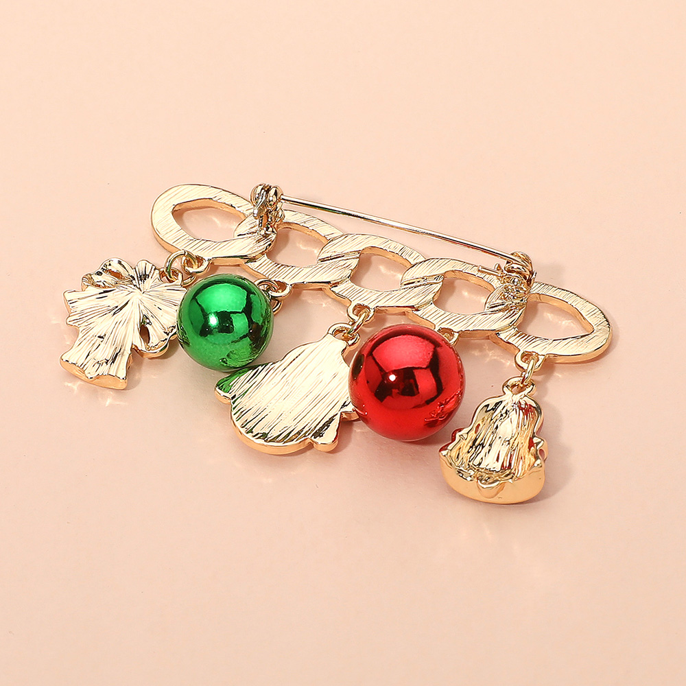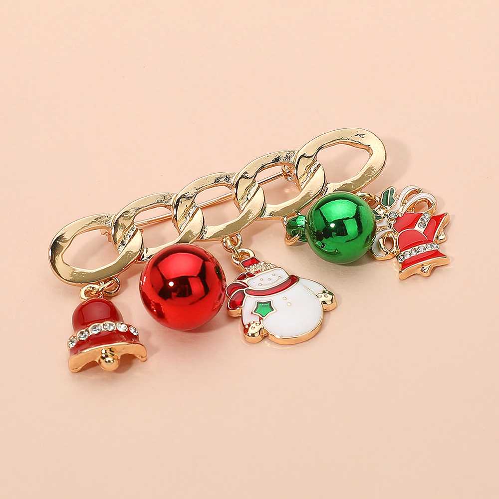 Details • Size : 2.5" X 0.4" • Charm Size : 1" L • Pin Brooch • Celebrate the season in style with this holiday brooch featuring festive charms including a snowman, ornaments, and bells. Designed with a secure clasp, this cheerful accessory adds a joyful touch to coats, scarves, or bags, making it a perfect piece for holiday outfits.
