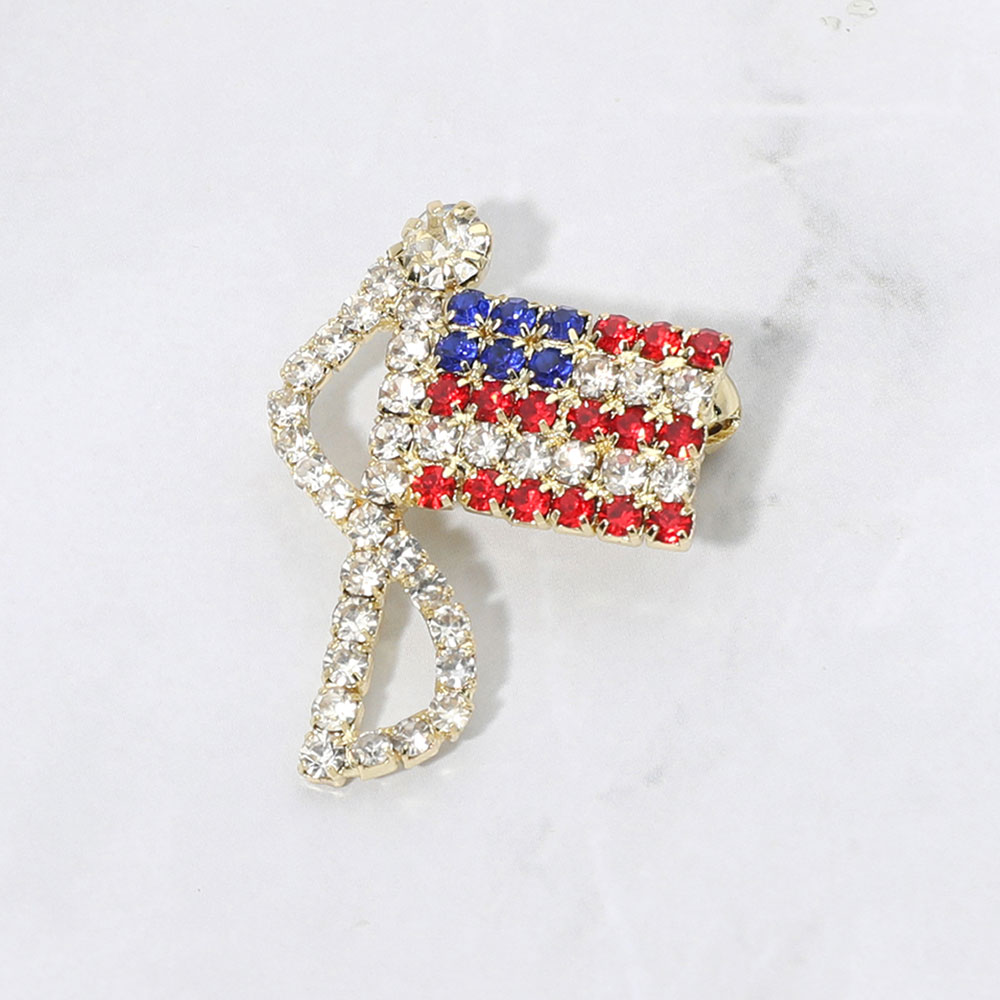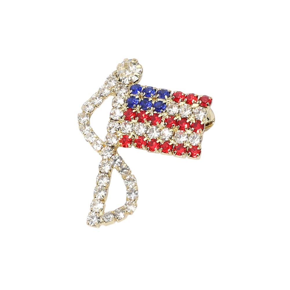 Details • Size : 1" X 1.25" • Pin Brooch • Statement flag inspired brooch designed with a flowing ribbon silhouette and shimmering rhinestone accents. A bold decorative accessory ideal for jackets, coats, scarves, hats, bags, and event outfits. Perfect for patriotic celebrations, themed events, gifting, or adding eye catching detail to everyday styling. • Lead and Nickel Compliant