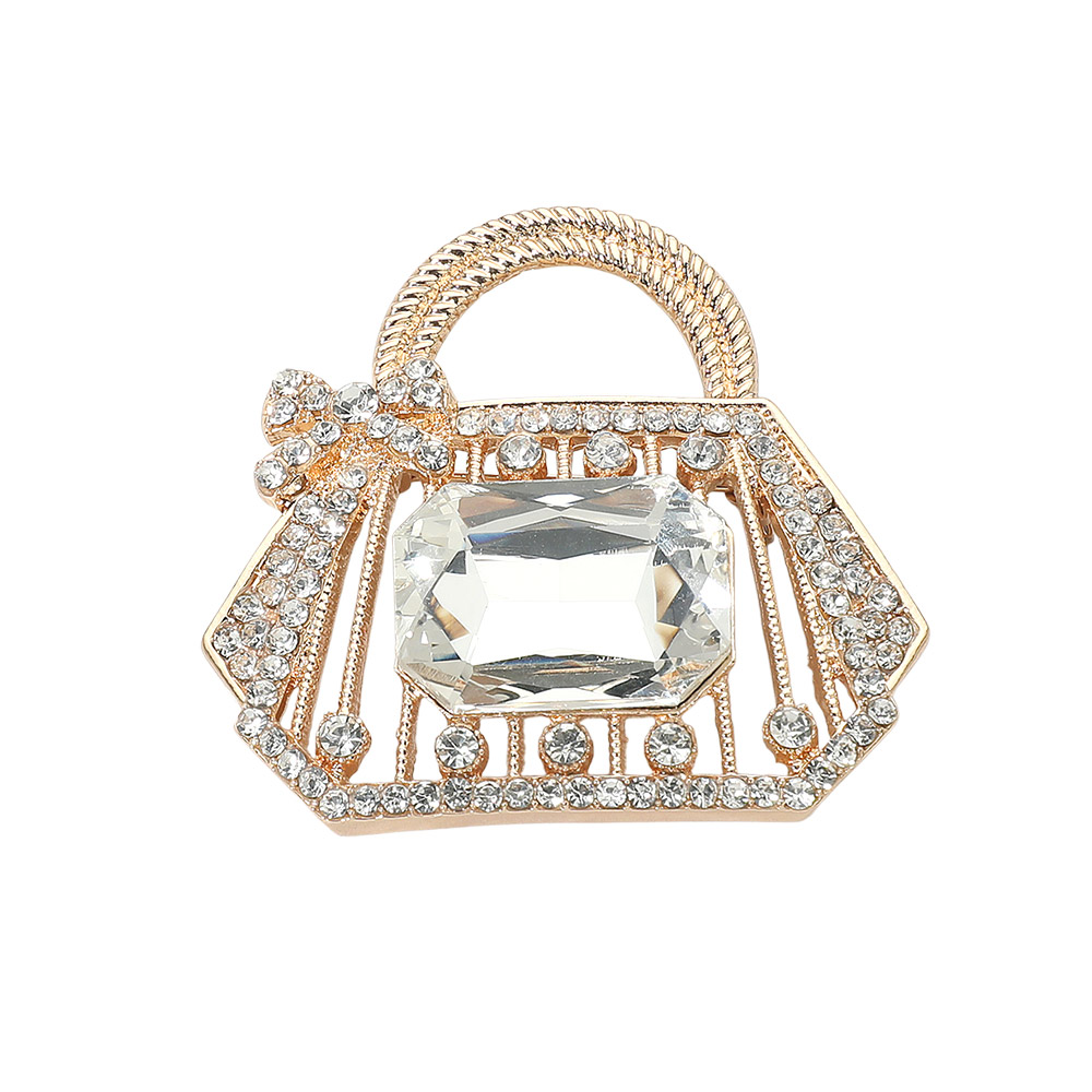 Details • Size : 2.1" X 2" • Pin Brooch • Elevate your style with this handbag-shaped brooch, featuring a large faceted crystal centerpiece, bow detail, and shimmering stones. A chic accessory for fashion lovers, it adds sparkle and charm to outfits for everyday or special occasions. • Lead and Nickel Compliant