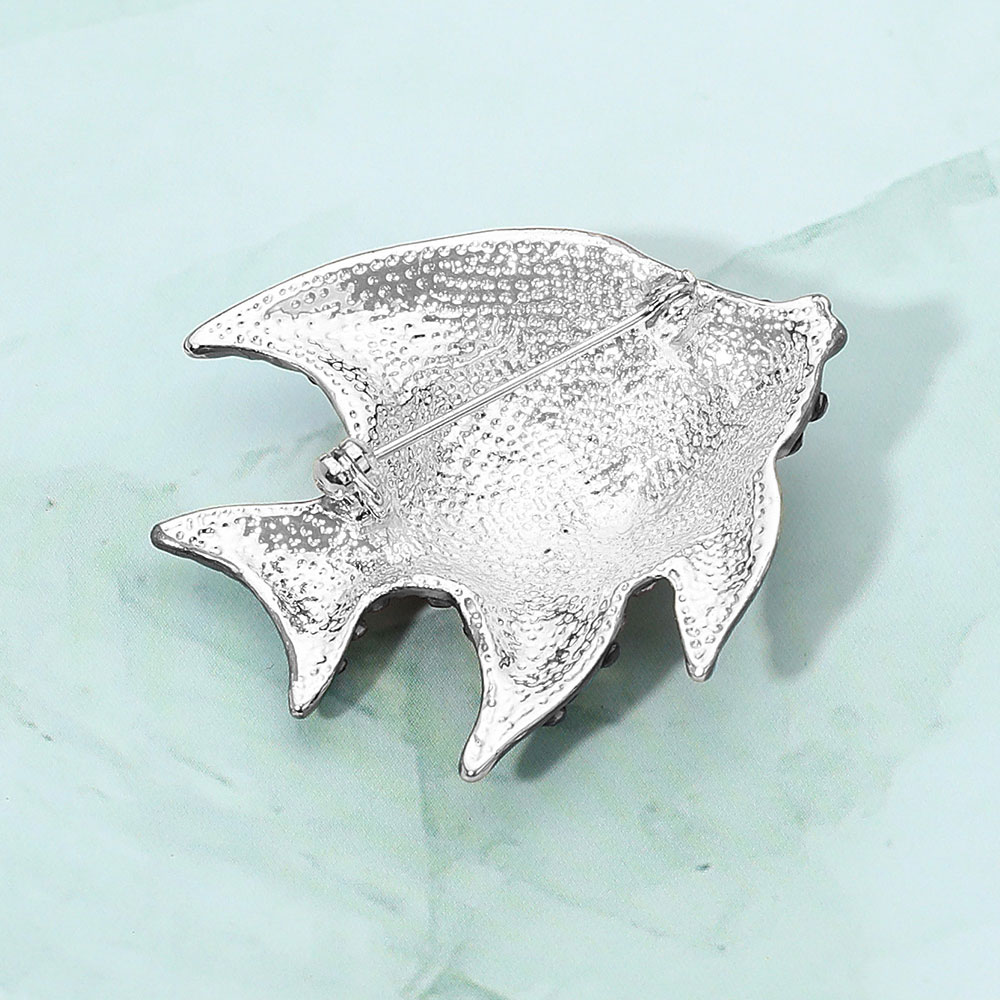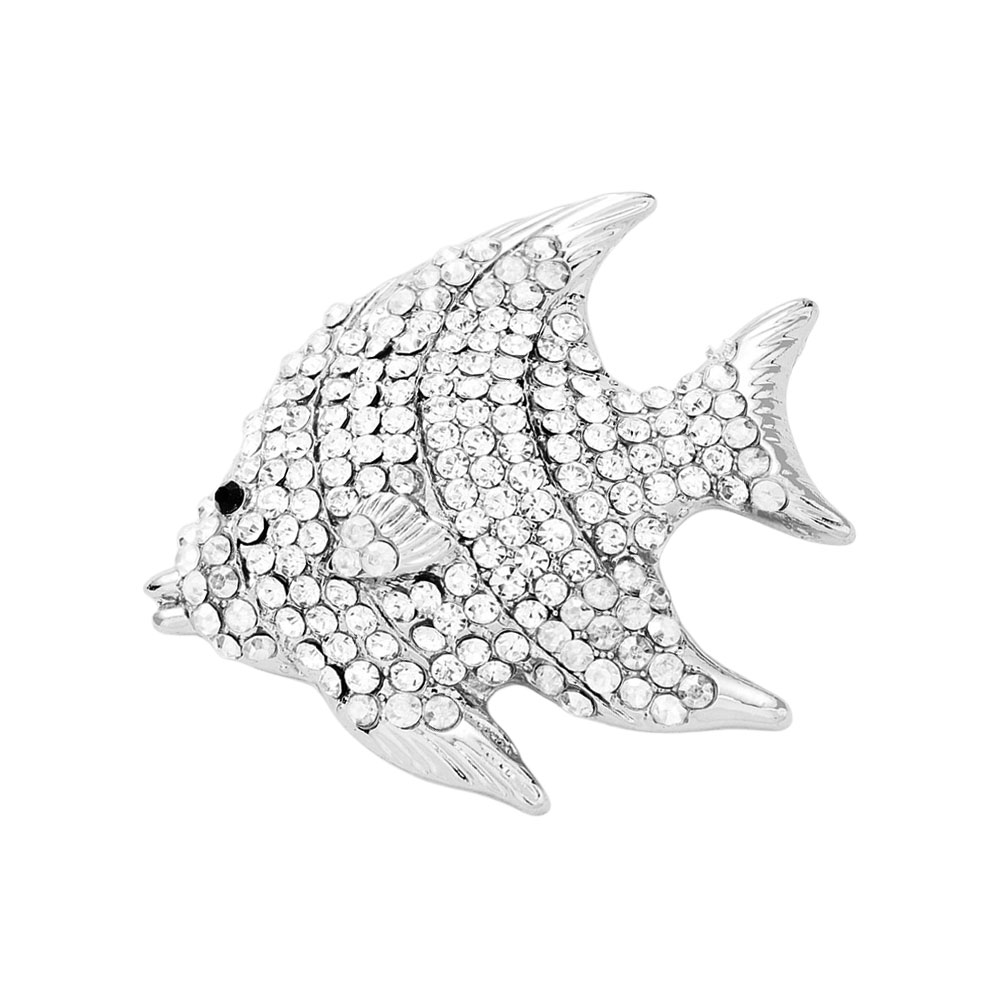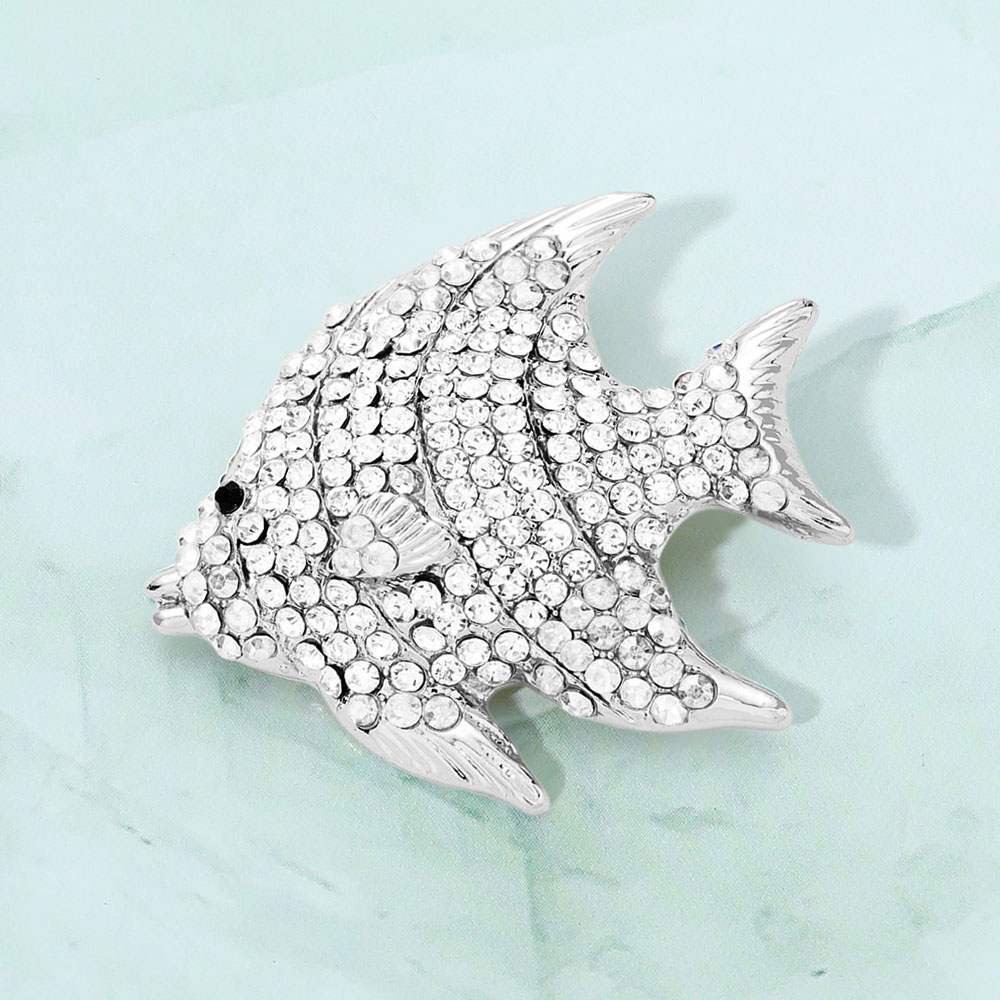 • Vibrant fish brooch adorned with sparkling rhinestones in a playful aquatic design. Perfect for adding a lively marine-themed accent to jackets, blouses, or bags with whimsical charm.
