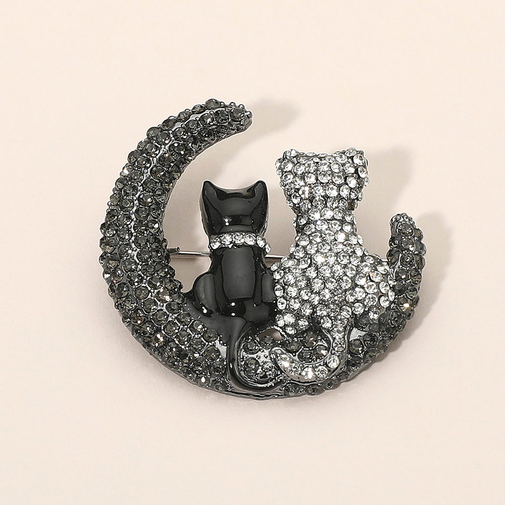 Details • Size : 1.75" X 1.75" • Pin Brooch • Charming cat and moon brooch adorned with dazzling crystals, featuring two cats sitting together on a crescent moon. A whimsical accessory that adds sparkle and personality to any outfit, perfect for animal lovers, collectors, or as a thoughtful gift with symbolic meaning. • Lead and Nickel Compliant • Sterling Silver Dipped